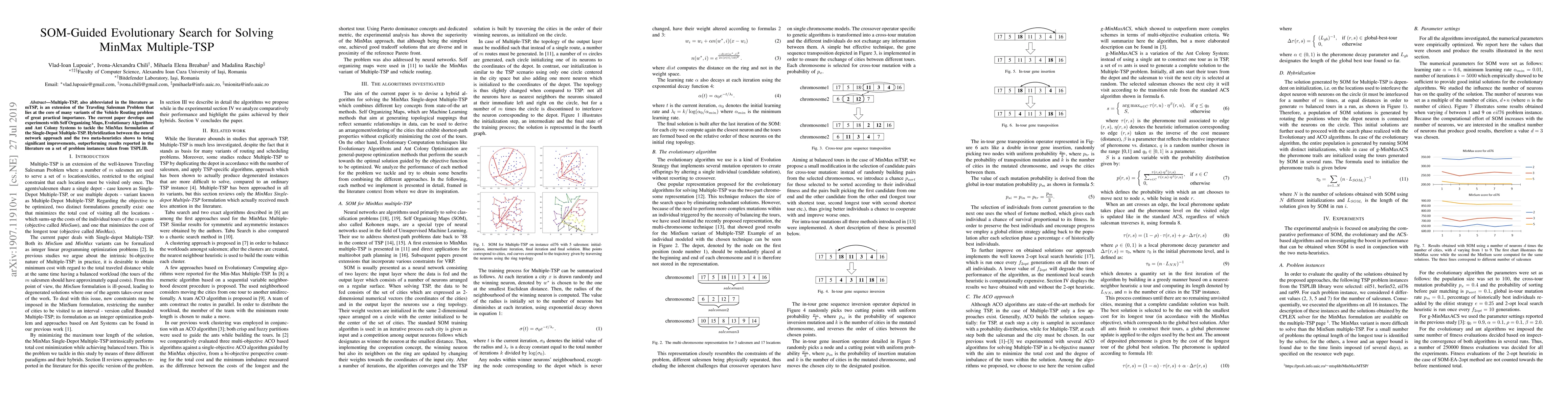 Multiple-TSP, also abbreviated in the literature as mTSP, is an extension of the Traveling Salesman Problem that lies at the core of many variants of the Vehicle Routing problem of great practical importance. The current paper develops and experiments with Self Organizing Maps, Evolutionary Algorithms and Ant Colony Systems to tackle the MinMax formulation of the Single-Depot Multiple-TSP. Hybridization between the neural network approach and the two meta-heuristics shows to bring significant improvements, outperforming results reported in the literature on a set of problem instances taken from TSPLIB.