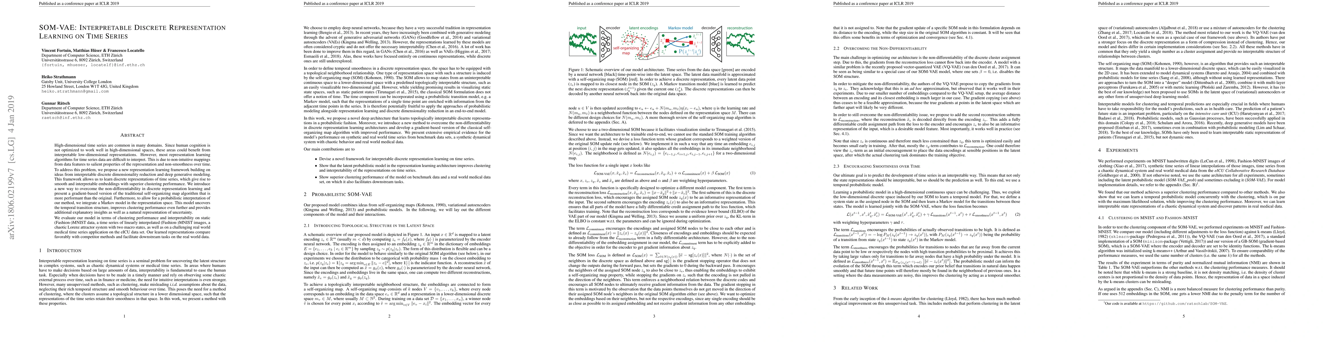 This paper proposes SOM-VAE, a framework for learning interpretable low-dimensional representations of high-dimensional time series data. It integrates a gradient-based self-organizing map with a Markov model to achieve smooth, interpretable embeddings and superior clustering performance, evaluated on various datasets including medical time series.