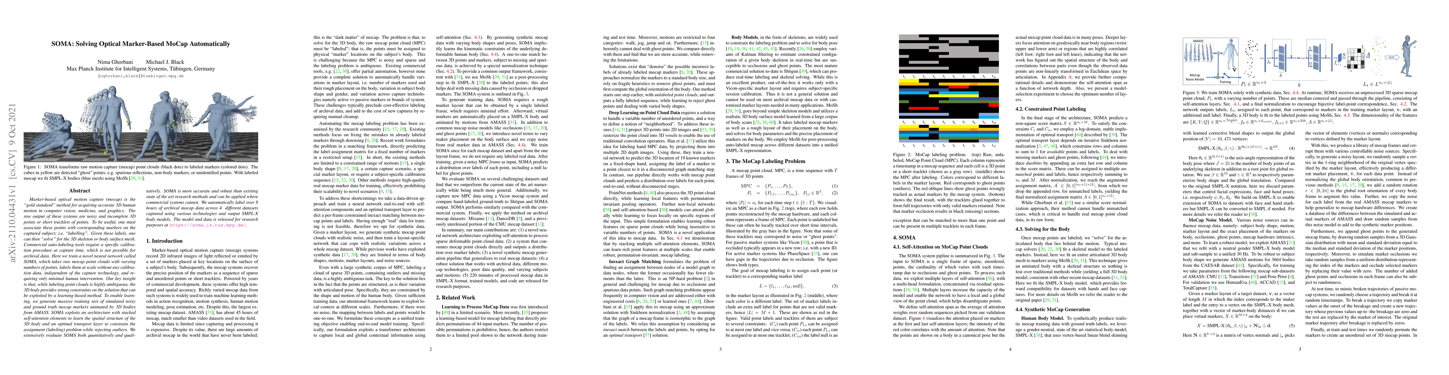 SOMA is a novel neural network that automatically labels noisy and incomplete 3D points from marker-based optical mocap systems without requiring calibration data, enabling its application to archival data. It leverages self-attention and optimal transport layers to exploit the spatial structure of the 3D body and accurately solve the labeling problem.