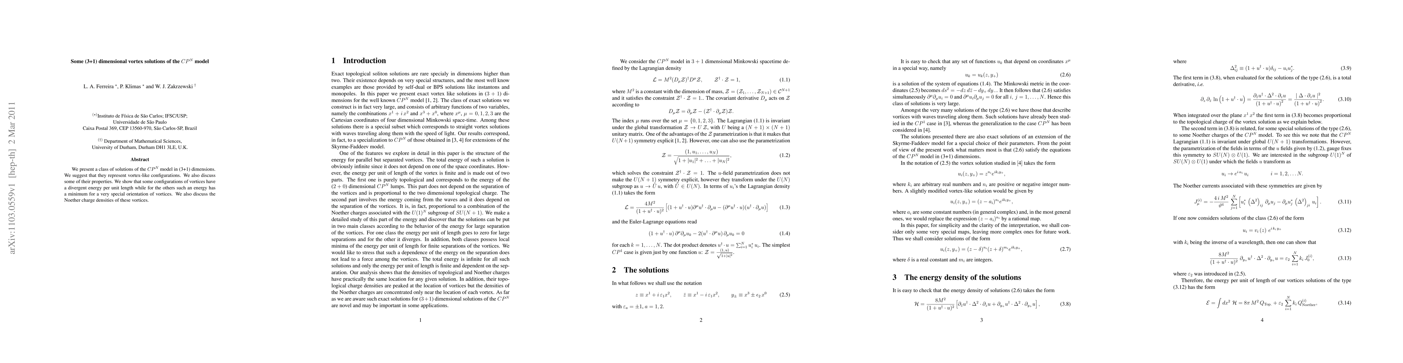 We present a class of solutions of the CPN model in (3+1) dimensions. We suggest that they represent vortex-like configurations. We also discuss some of their properties. We show that some configurations of vortices have a divergent energy per unit length while for the others such an energy has a minimum for a very special orientation of vortices. We also discuss the Noether charge densities of these vortices.