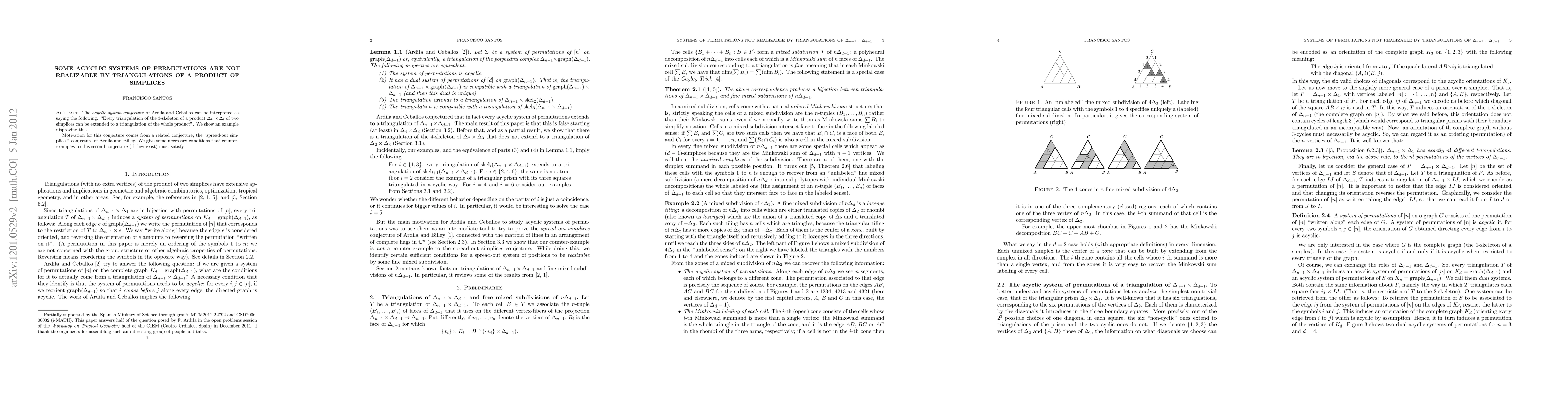 The acyclic system conjecture of Ardila and Ceballos can be interpreted as saying the following: "Every triangulation of the 3-skeleton of a product of two simplices can be extended to a triangulation of the whole product". We show a counter-example to this. Motivation for this conjecture comes from a related conjecture, the "spread-out simplices" conjecture of Ardila and Billey. We give some necessary conditions that counter-examples to this second conjecture (if they exist) must satisfy.