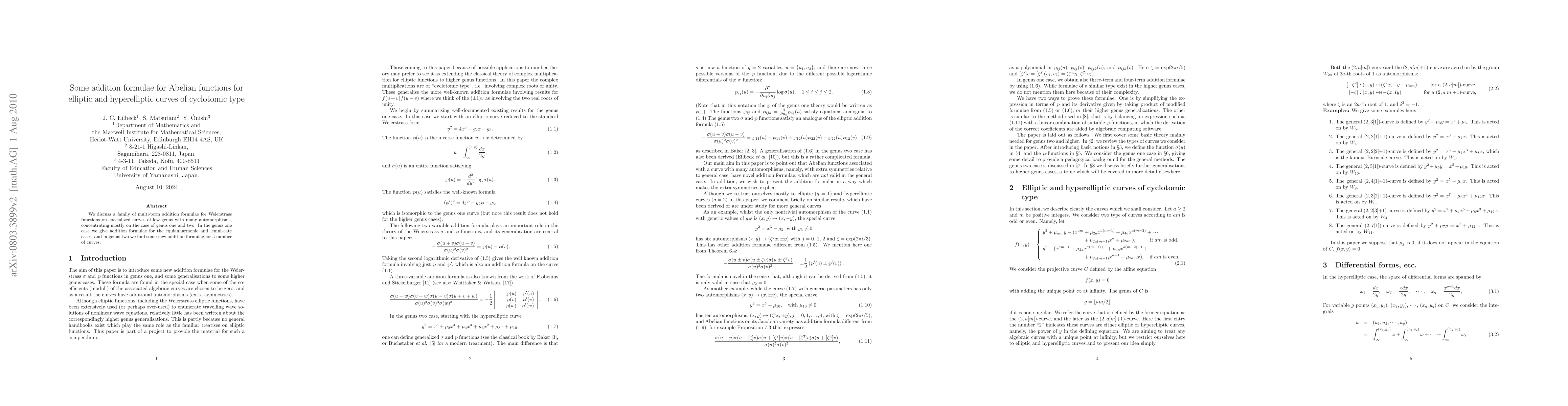 This paper presents new multi-term addition formulae for Weierstrass functions on elliptic and hyperelliptic curves of cyclotomic type, including novel results for the equianharmonic and lemniscate cases in genus one and for several curves in genus two, such as the Burnside curve.