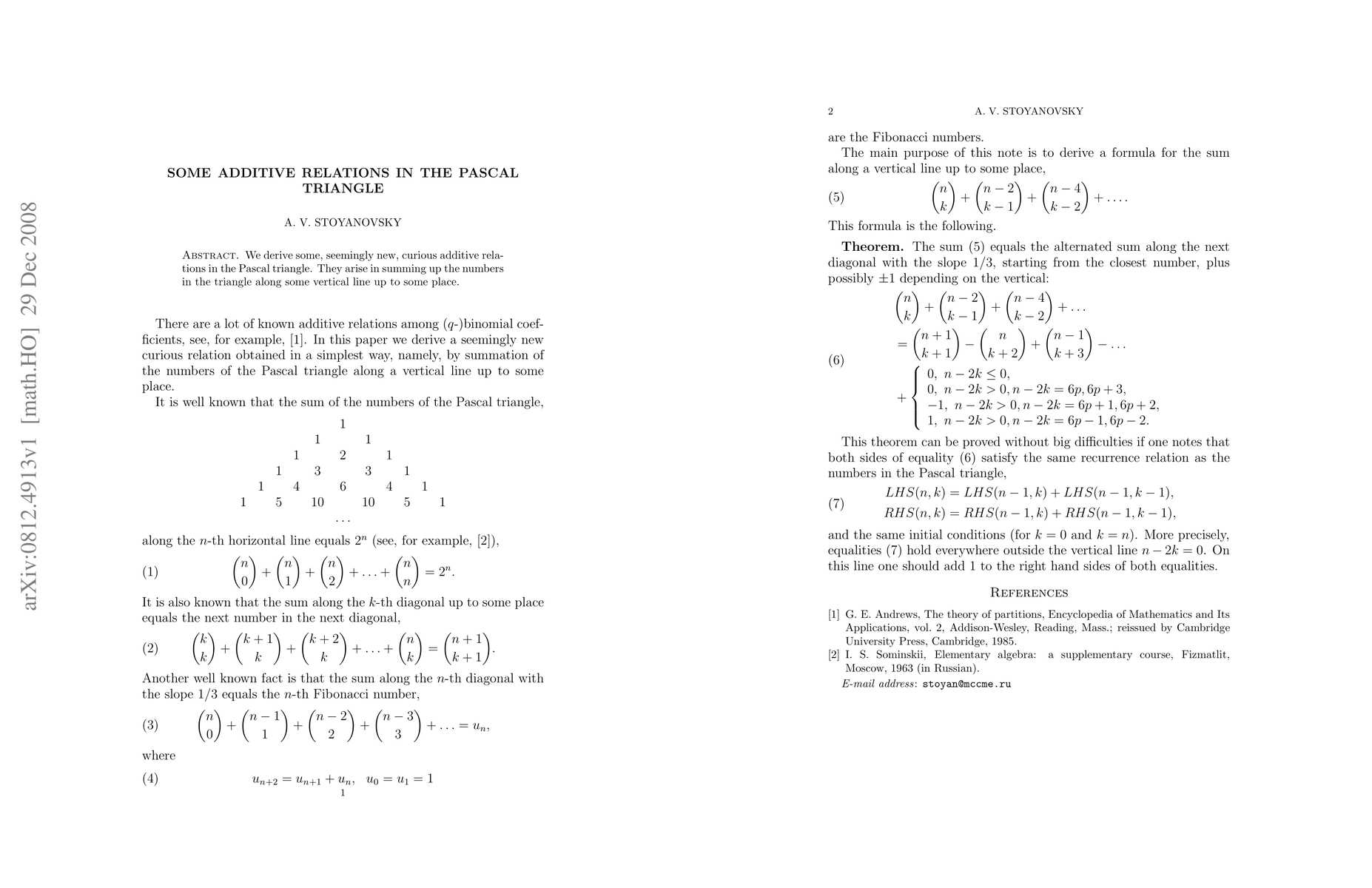 Summary: This paper introduces novel additive relations in the Pascal triangle, specifically focusing on summing numbers along vertical lines up to certain positions, revealing intriguing patterns not previously documented.