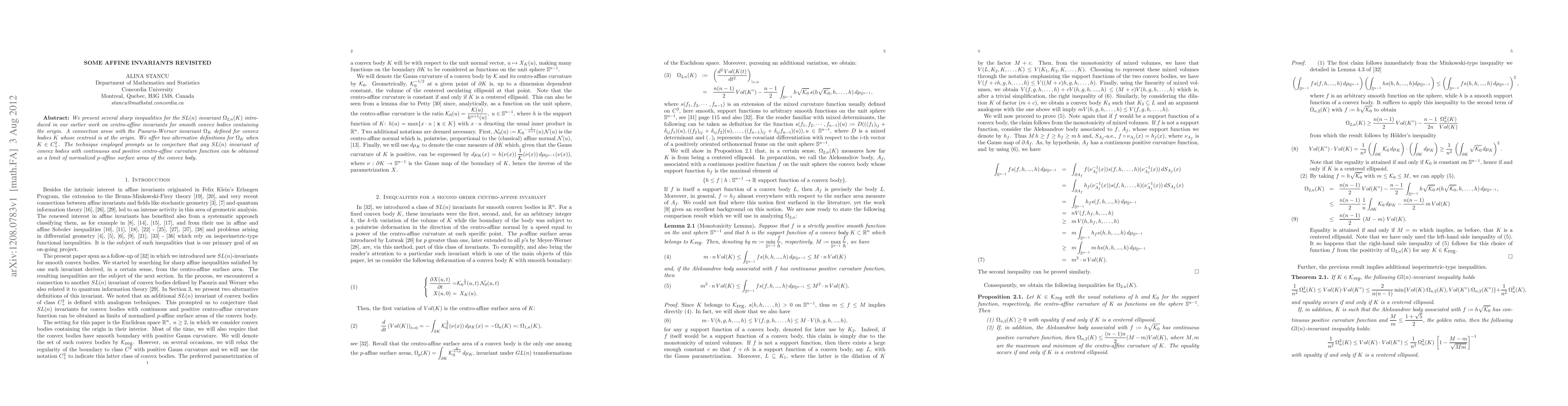 This paper revisits sharp inequalities for the SL(n) invariant $\Omega_{2,n}(K)$ and connects it with the Pauris-Werner invariant $\Omega_K$. The authors propose two alternative definitions for $\Omega_K$ and conjecture that any SL(n) invariant with continuous and positive centro-affine curvature can be derived from normalized $p$-affine surface areas.