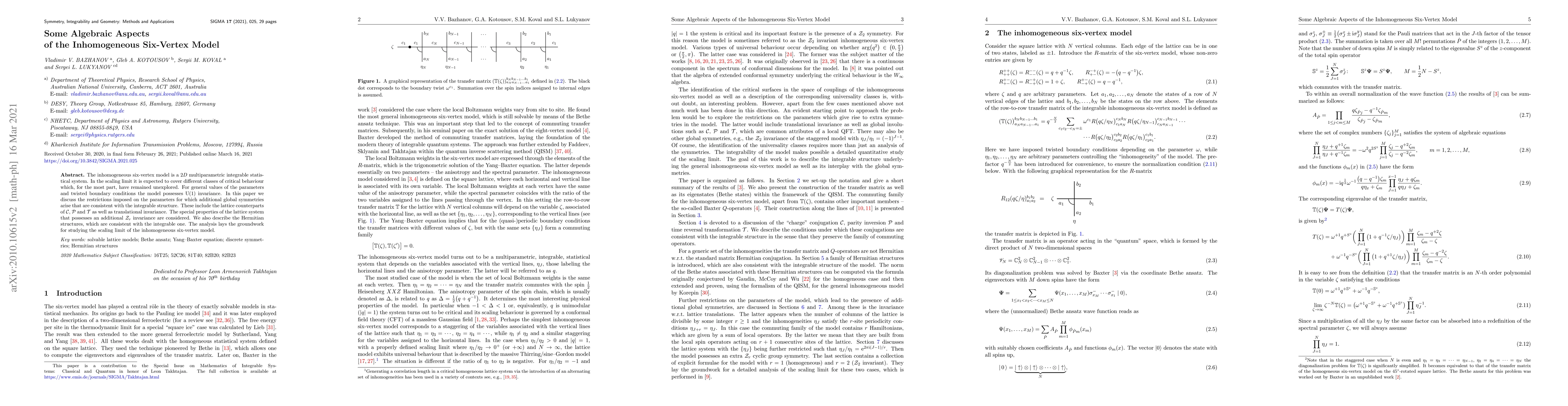 The inhomogeneous six-vertex model is a 2$D$ multiparametric integrable statistical system. In the scaling limit it is expected to cover different classes of critical behaviour which, for the most part, have remained unexplored. For general values of the parameters and twisted boundary conditions the model possesses ${\rm U}(1)$ invariance. In this paper we discuss the restrictions imposed on the parameters for which additional global symmetries arise that are consistent with the integrable structure. These include the lattice counterparts of ${\cal C}$, ${\cal P}$ and ${\cal T}$ as well as translational invariance. The special properties of the lattice system that possesses an additional ${\cal Z}_r$ invariance are considered. We also describe the Hermitian structures, which are consistent with the integrable one. The analysis lays the groundwork for studying the scaling limit of the inhomogeneous six-vertex model.
