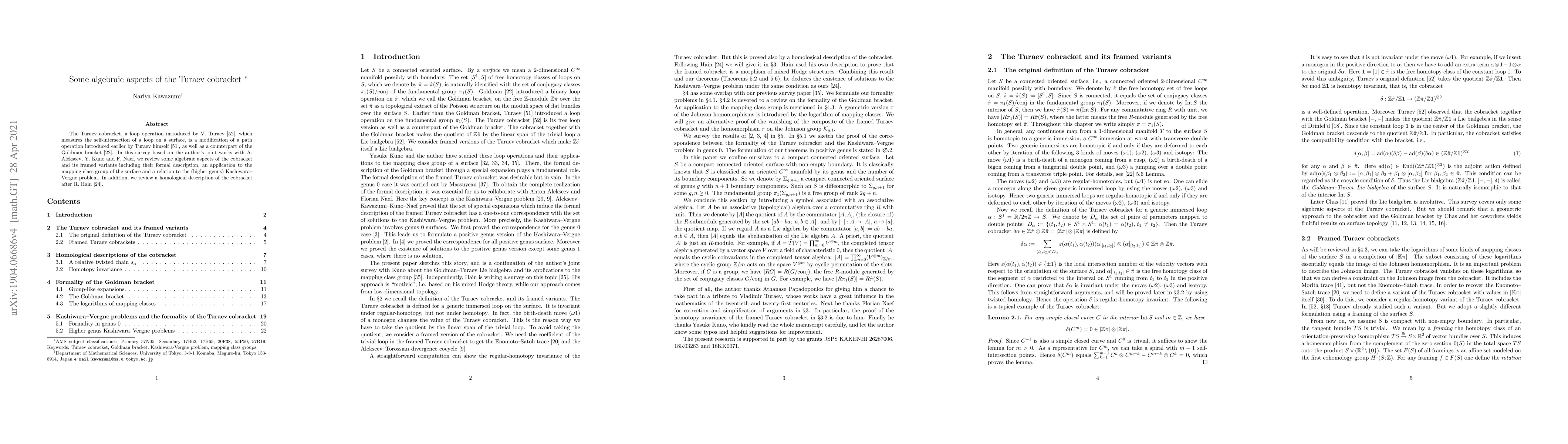This paper surveys algebraic aspects of the Turaev cobracket, focusing on its formal description, applications to the mapping class group, and connections to the Kashiwara-Vergne problem, alongside a homological perspective by R. Hain.