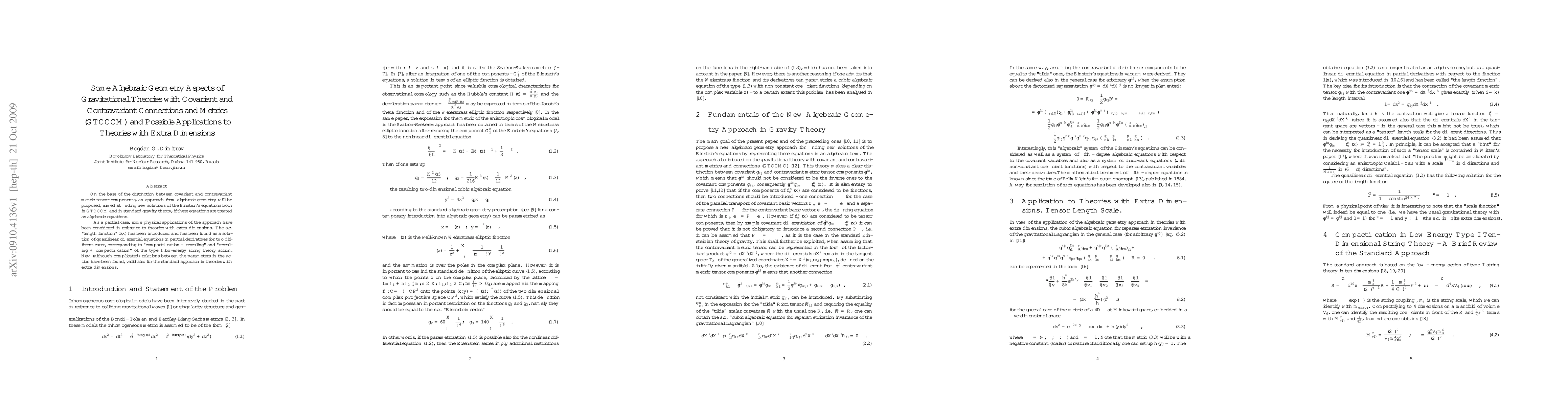 This paper proposes an algebraic geometry approach to solve Einstein's equations by distinguishing covariant and contravariant metric tensor components, finding new solutions in both GTCCCM and standard gravity. It also explores applications to theories with extra dimensions, introducing a "length function" and deriving new relations for parameters in the low-energy string theory action.