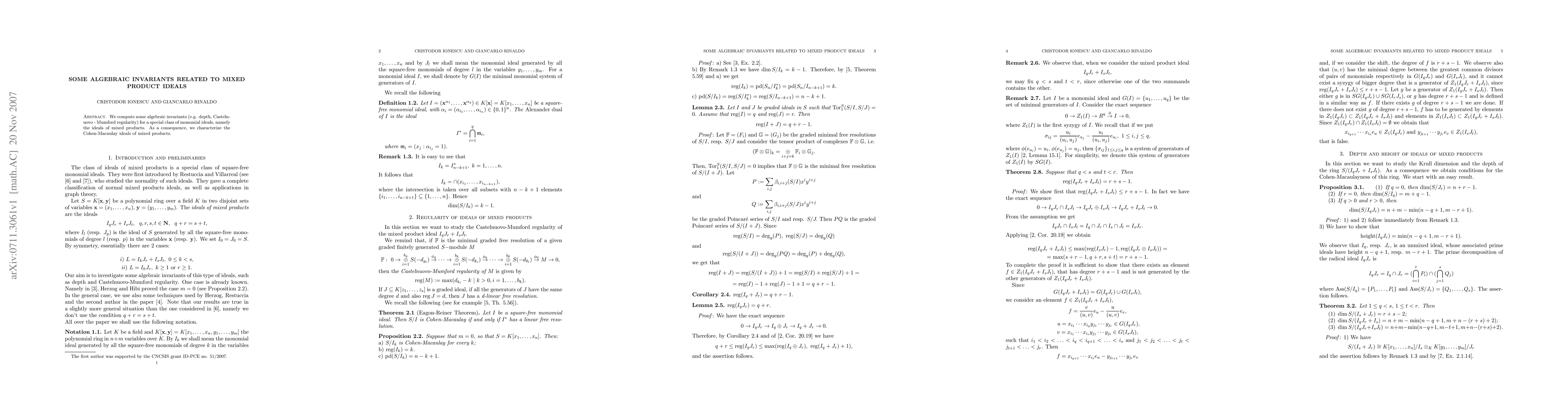 We compute some algebraic invariants (e.g. depth, Castelnuovo - Mumford regularity) for a special class of monomial ideals, namely the ideals of mixed products. As a consequence, we characterize the Cohen-Macaulay ideals of mixed products.