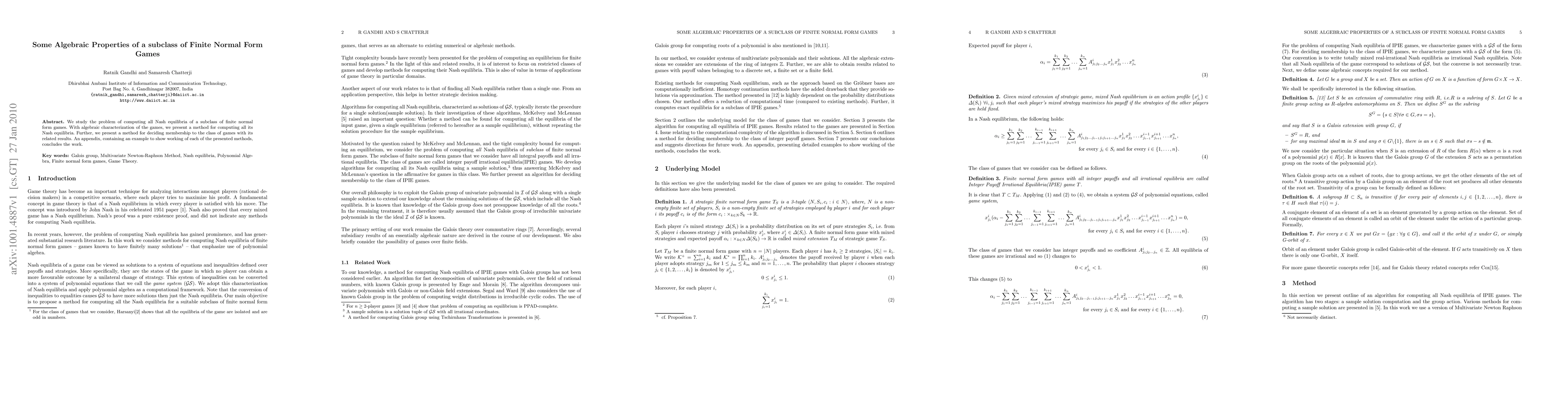 This paper develops algebraic methods for computing Nash equilibria in a specific subclass of finite normal form games and provides a technique for determining if a given game belongs to this subclass, accompanied by an illustrative example in the appendix.