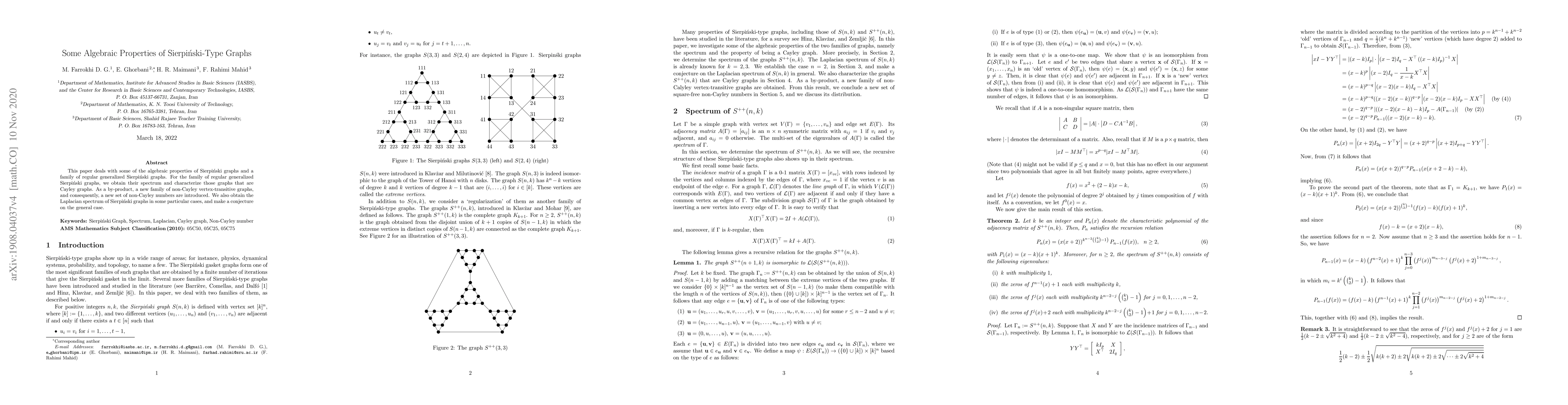 This paper investigates algebraic properties of Sierpiński graphs and their generalized regular versions, determining their spectra and identifying Cayley graphs. It introduces a new family of non-Cayley vertex-transitive graphs and conjectures a general case for the Laplacian spectrum of Sierpiński graphs.