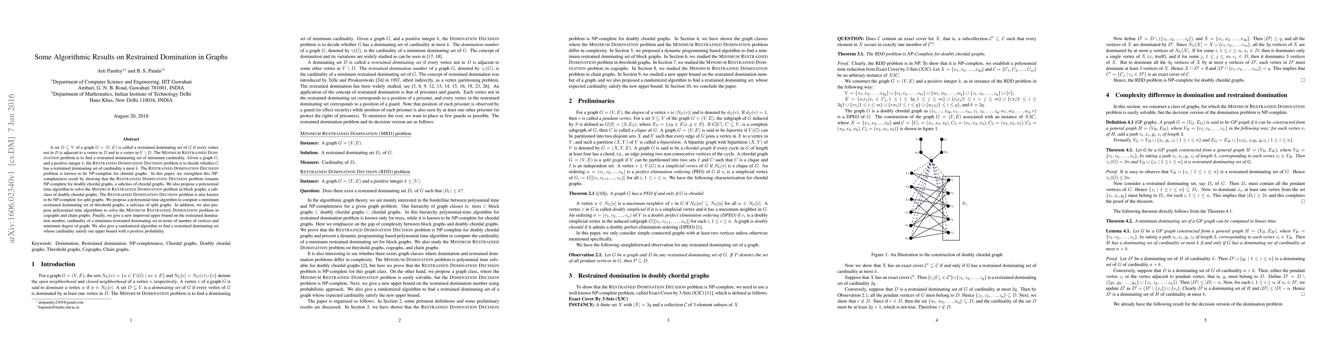 A set $D\subseteq V$ of a graph $G=(V,E)$ is called a restrained dominating set of $G$ if every vertex not in $D$ is adjacent to a vertex in $D$ and to a vertex in $V \setminus D$. The \textsc{Minimum Restrained Domination} problem is to find a restrained dominating set of minimum cardinality. Given a graph $G$, and a positive integer $k$, the \textsc{Restrained Domination Decision} problem is to decide whether $G$ has a restrained dominating set of cardinality a most $k$. The \textsc{Restrained Domination Decision} problem is known to be NP-complete for chordal graphs. In this paper, we strengthen this NP-completeness result by showing that the \textsc{Restrained Domination Decision} problem remains NP-complete for doubly chordal graphs, a subclass of chordal graphs. We also propose a polynomial time algorithm to solve the \textsc{Minimum Restrained Domination} problem in block graphs, a subclass of doubly chordal graphs. The \textsc{Restrained Domination Decision} problem is also known to be NP-complete for split graphs. We propose a polynomial time algorithm to compute a minimum restrained dominating set of threshold graphs, a subclass of split graphs. In addition, we also propose polynomial time algorithms to solve the \textsc{Minimum Restrained Domination} problem in cographs and chain graphs. Finally, we give a new improved upper bound on the restrained domination number, cardinality of a minimum restrained dominating set in terms of number of vertices and minimum degree of graph. We also give a randomized algorithm to find a restrained dominating set whose cardinality satisfy our upper bound with a positive probability.