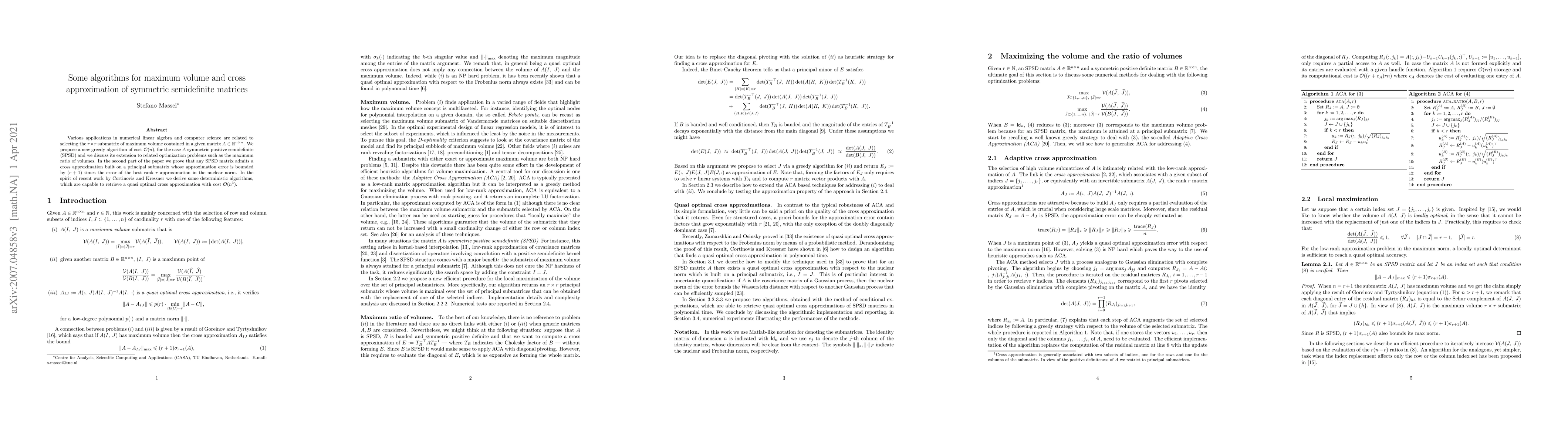 This paper proposes a new $\mathcal O(n)$ greedy algorithm for the maximum volume submatrix problem in symmetric positive semidefinite matrices and extends it to maximum volume ratio optimization. It also proves that any such matrix can be approximated by a principal submatrix with an error bound and presents deterministic algorithms for quasi-optimal cross approximations at $\mathcal O(n^3)$ cost.