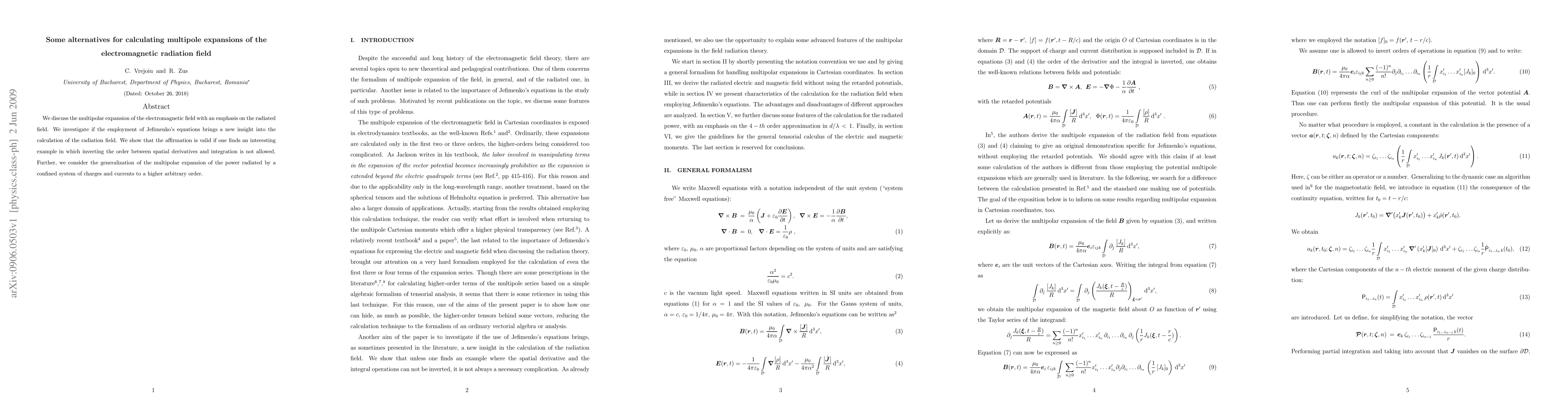 This paper explores alternative methods for calculating multipole expansions of electromagnetic radiation fields, including the use of Jefimenko's equations and higher-order power radiated by confined systems of charges and currents.
