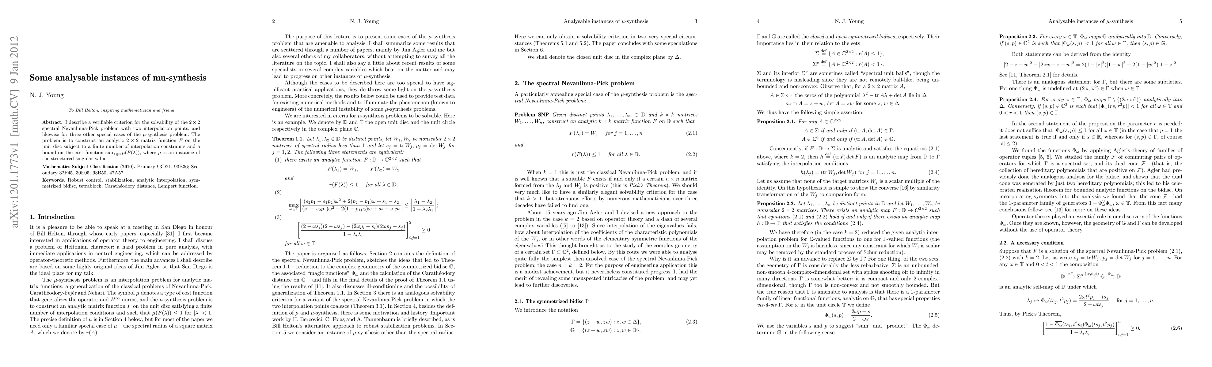 I describe a verifiable criterion for the solvability of the 2 by 2 spectral Nevanlinna-Pick problem with two interpolation points, and likewise for three other special cases of the mu-synthesis problem. The problem is to construct an analytic 2 by 2 matrix function F on the unit disc subject to a finite number of interpolation constraints and a bound on the cost function sup {mu(F(z)): |z| < 1}, where mu is an instance of the structured singular value of a 2 by 2 matrix.