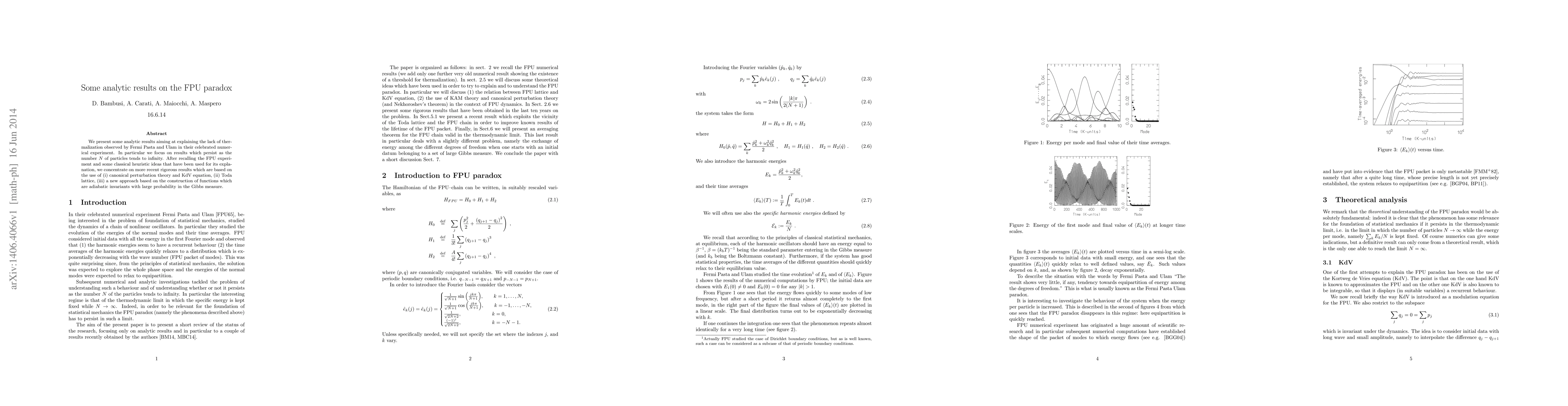 This paper presents analytic results on the FPU paradox, a long-standing problem in statistical mechanics, providing insights into why particles often fail to thermalize. The research uses advanced mathematical techniques, including canonical perturbation theory and adiabatic invariants, to better understand this phenomenon.