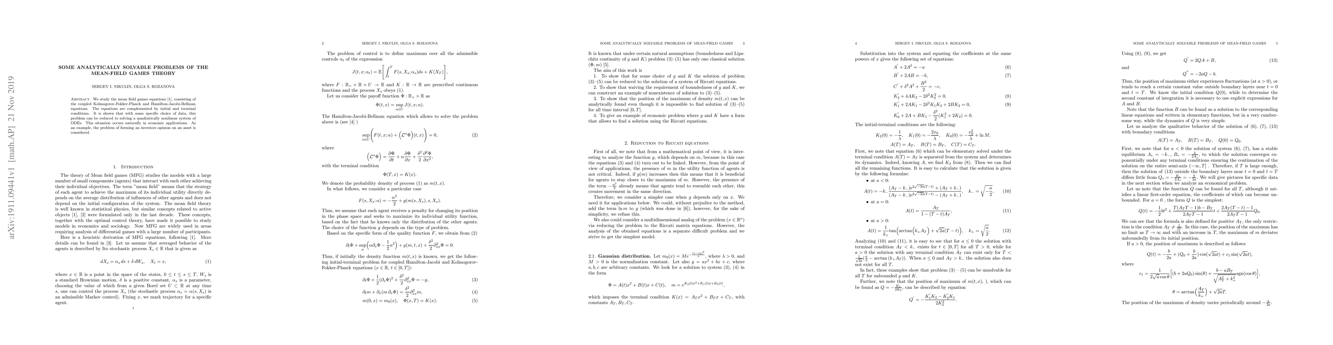 We study the mean field games equations, consisting of the coupled Kolmogorov-Fokker-Planck and Hamilton-Jacobi-Bellman equations. The equations are complemented by initial and terminal conditions. It is shown that with some specific choice of data, this problem can be reduced to solving a quadratically nonlinear system of ODEs. This situation occurs naturally in economic applications. As an example, the problem of forming an investor's opinion on an asset is considered.