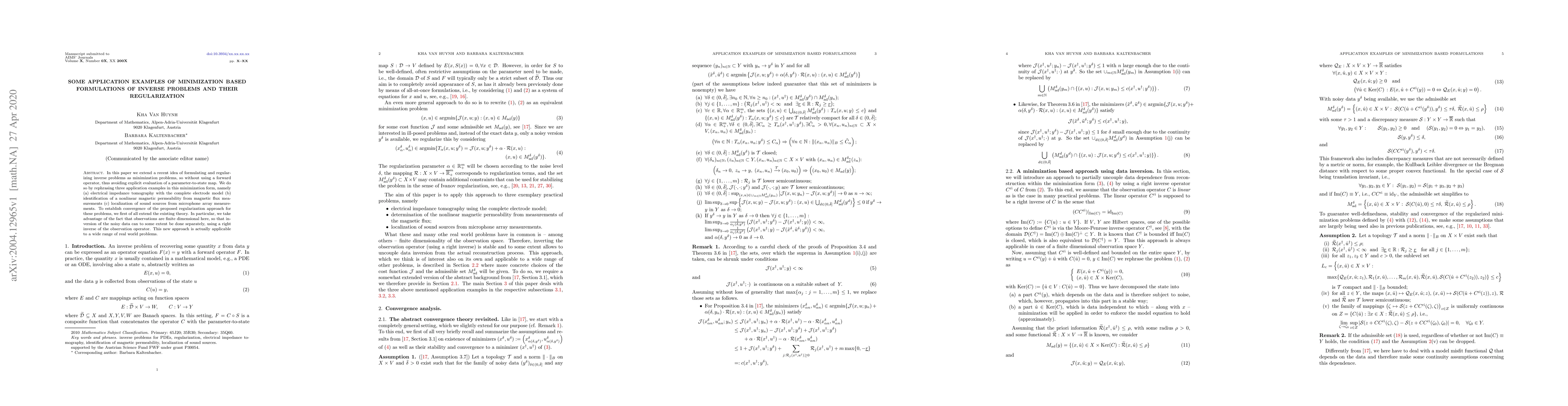 This paper reformulates and regularizes three inverse problems—electrical impedance tomography, magnetic permeability identification, and sound source localization—as minimization problems without a forward operator. It extends existing theory to establish convergence, leveraging finite-dimensional observations and a right inverse of the observation operator for regularization.