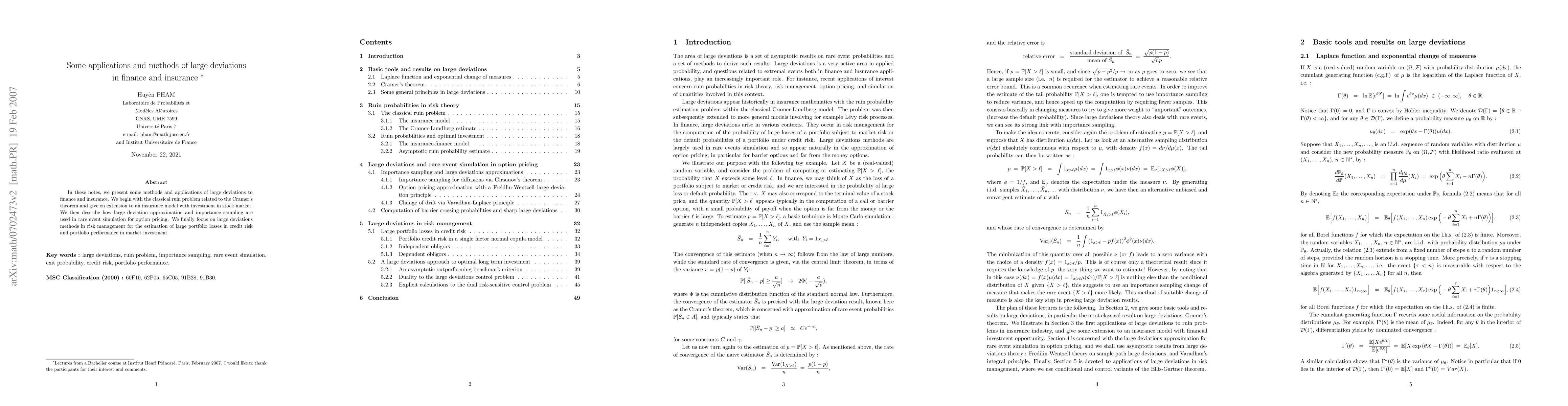 Summary: This paper explores the application of large deviations theory in finance and insurance, starting with the classical ruin problem and extending to stock market investment models. It also discusses the use of large deviation approximation and importance sampling for rare event simulation in option pricing, and applies these methods to risk management for estimating large portfolio losses in credit risk and market investment performance.