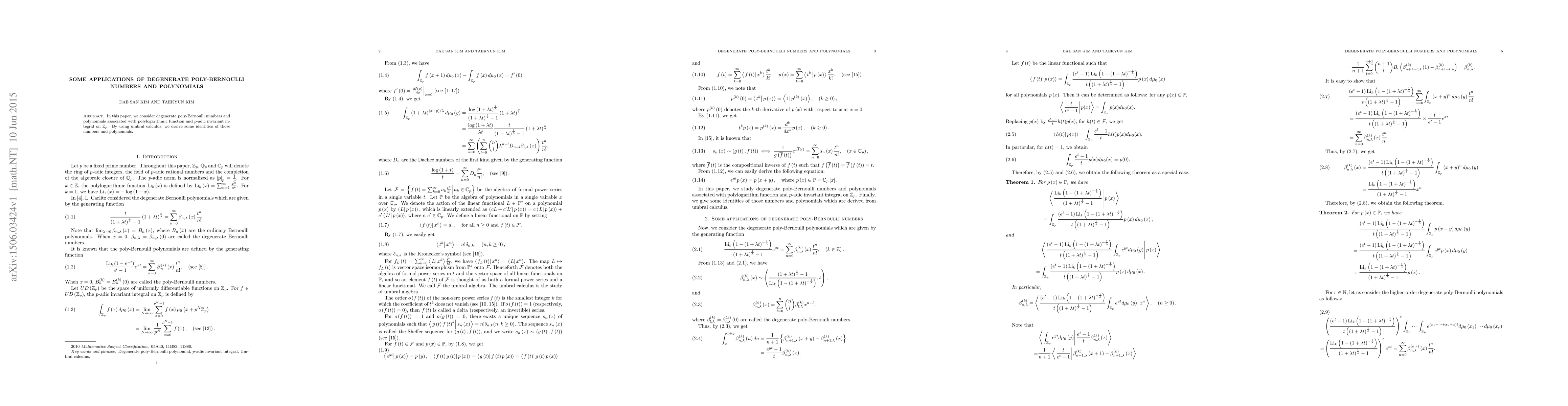 Summary: This paper explores degenerate poly-Bernoulli numbers and polynomials linked with polylogarithmic functions and p-adic integrals. It employs umbral calculus to derive significant identities for these mathematical constructs.