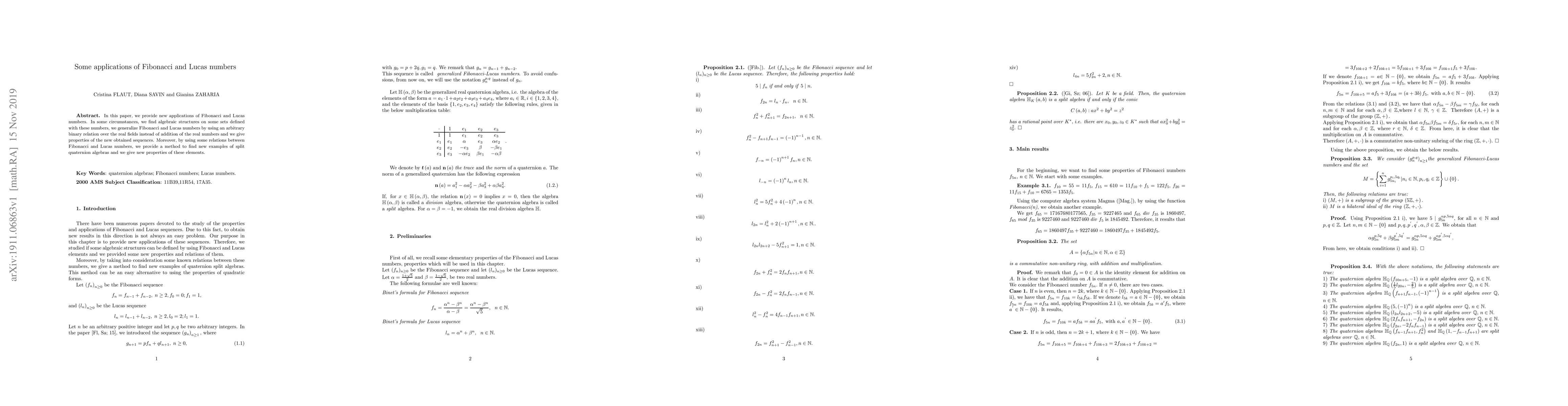 This paper explores new applications of Fibonacci and Lucas numbers, including algebraic structures on sets defined by these numbers, generalizations via binary relations, and properties of the resulting sequences. It also introduces methods for finding split quaternion algebras and provides new properties of these elements.