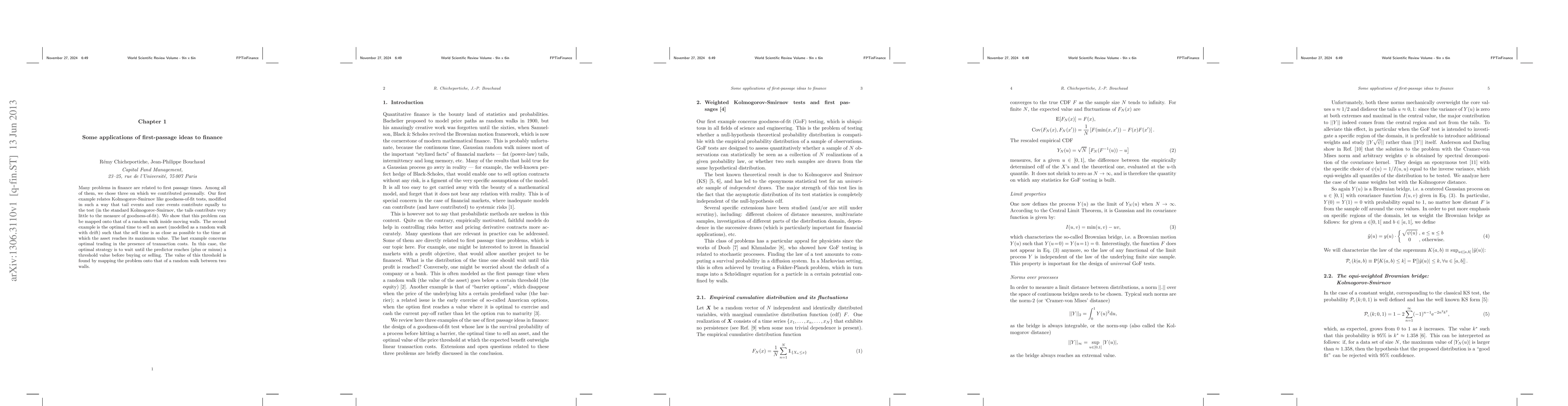 Many problems in finance are related to first passage times. Among all of them, we chose three on which we contributed personally. Our first example relates Kolmogorov-Smirnov like goodness-of-fit tests, modified in such a way that tail events and core events contribute equally to the test (in the standard Kolmogorov-Smirnov, the tails contribute very little to the measure of goodness-of-fit). We show that this problem can be mapped onto that of a random walk inside moving walls. The second example is the optimal time to sell an asset (modelled as a random walk with drift) such that the sell time is as close as possible to the time at which the asset reaches its maximum value. The last example concerns optimal trading in the presence of transaction costs. In this case, the optimal strategy is to wait until the predictor reaches (plus or minus) a threshold value before buying or selling. The value of this threshold is found by mapping the problem onto that of a random walk between two walls.