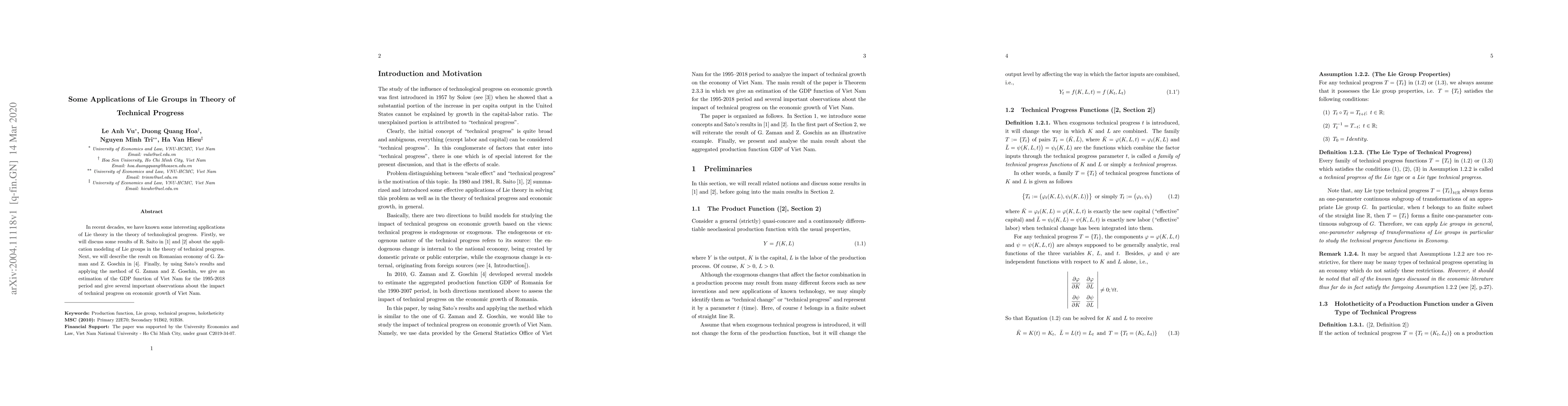 In recent decades, we have known some interesting applications of Lie theory in the theory of technological progress. Firstly, we will discuss some results of R. Saito in \cite{rS1980} and \cite{rS1981} about the application modeling of Lie groups in the theory of technical progress. Next, we will describe the result on Romanian economy of G. Zaman and Z. Goschin in \cite{ZG2010}. Finally, by using Sato's results and applying the method of G. Zaman and Z. Goschin, we give an estimation of the GDP function of Viet Nam for the 1995-2018 period and give several important observations about the impact of technical progress on economic growth of Viet Nam.