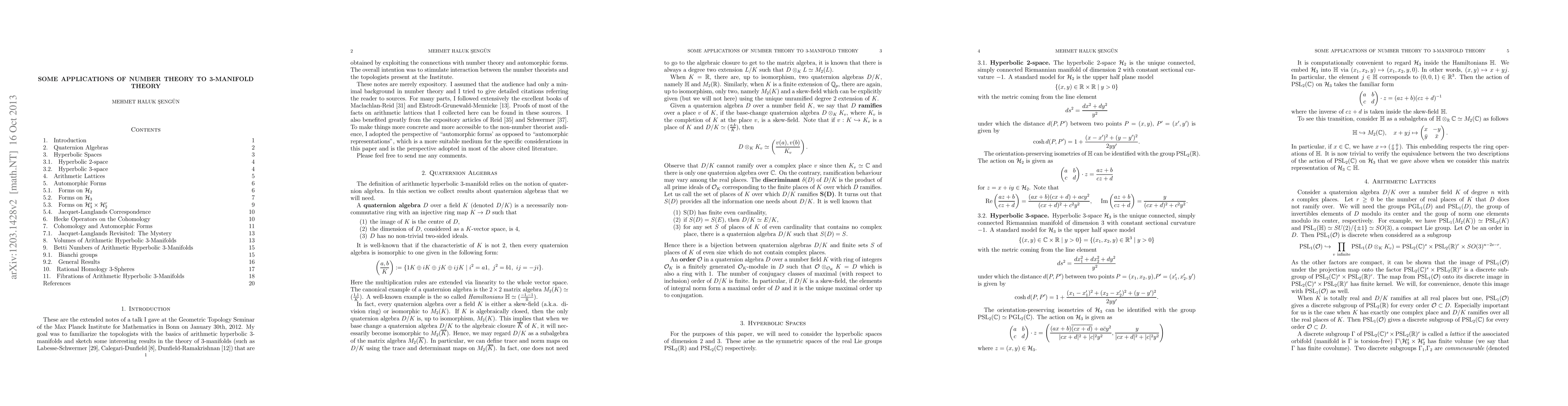 These are the extended notes of a talk I gave at the Geometric Topology Seminar of the Max Planck Institute for Mathematics in Bonn on January 30th, 2012. My goal was to familiarize the topologists with the basics of arithmetic hyperbolic 3-manifolds and sketch some interesting results in the theory of 3-manifolds (such as Labesse-Schwermer, Calegari-Dunfield, Dunfield-Ramakrishnan) that are obtained by exploiting the connections with number theory and automorphic forms. The overall intention was to stimulate interaction between the number theorists and the topologists present at the Institute.