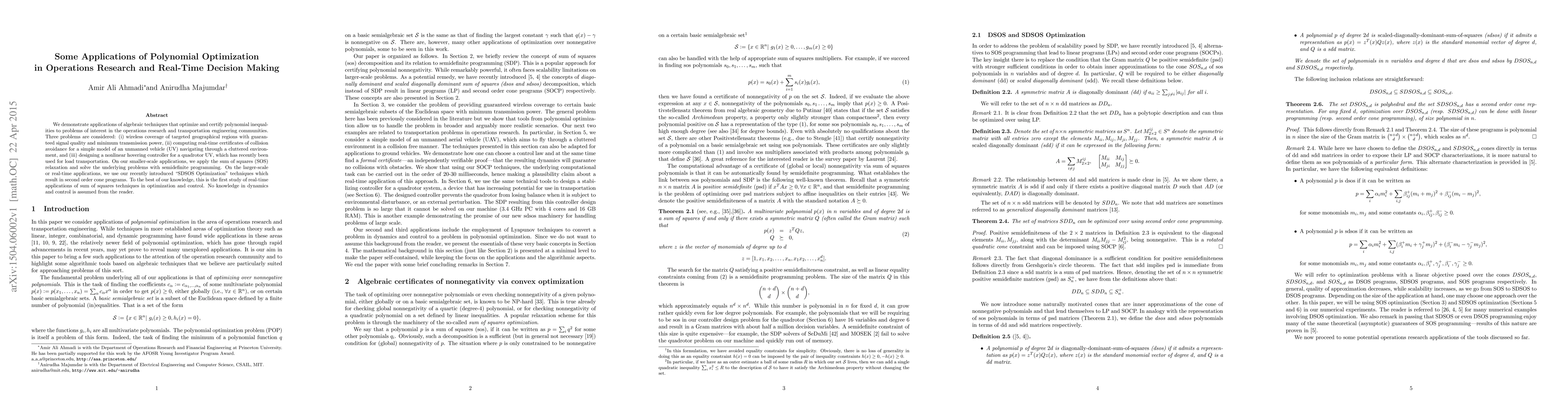 This paper demonstrates applications of polynomial optimization techniques to real-time decision making in operations research and transportation engineering, including wireless coverage, collision avoidance, and quadrotor control.