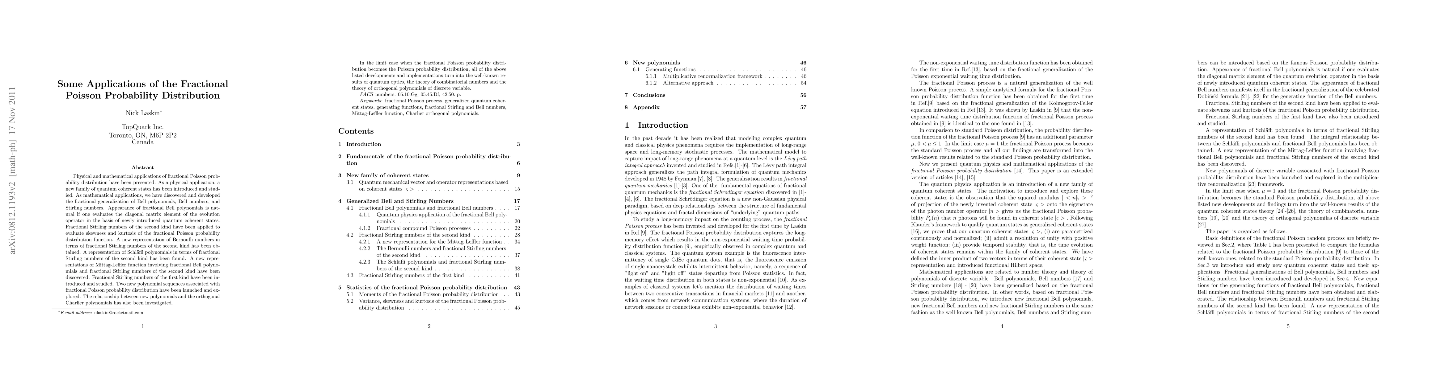 This paper explores the fractional Poisson probability distribution, introducing new quantum coherent states and developing fractional generalizations of Bell polynomials, Bell numbers, and Stirling numbers. It also presents new representations of Bernoulli numbers and Schlafli polynomials, alongside two new polynomial sequences linked to the fractional Poisson distribution.