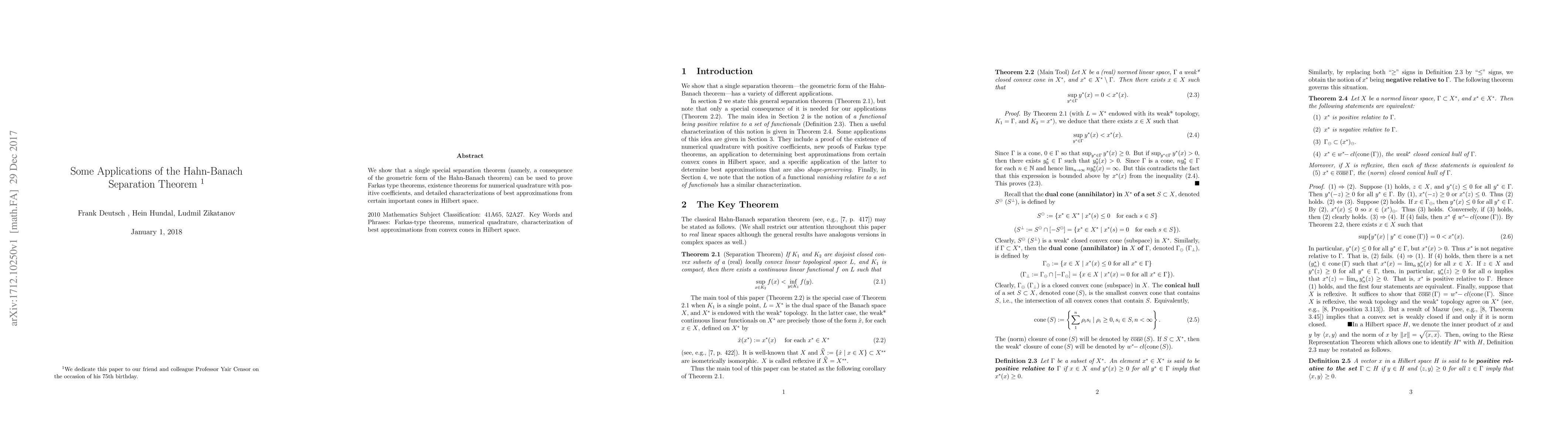 This paper demonstrates the utility of a specific separation theorem derived from the Hahn-Banach theorem in proving Farkas type theorems, establishing existence for numerical quadrature with positive coefficients, and characterizing best approximations within certain cones in Hilbert space.