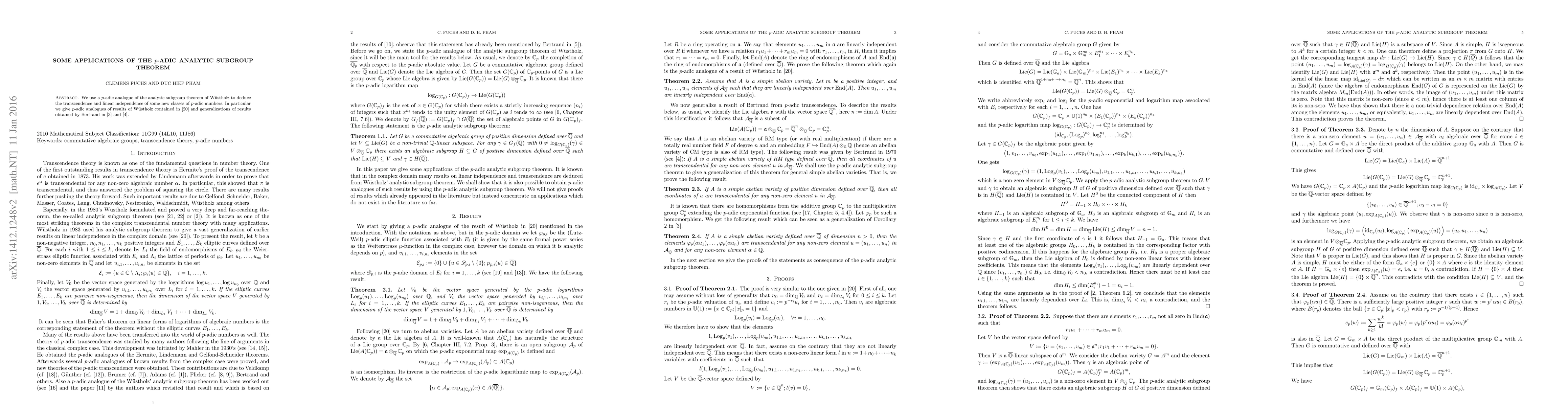 We use a $p$-adic analogue of the analytic subgroup theorem of W\"ustholz to deduce the transcendence and linear independence of some new classes of $p$-adic numbers. In particular we give $p$-adic analogues of results of W\"ustholz contained in [G. W\"ustholz, Some remarks on a conjecture of Waldschmidt, Diophantine approximations and transcendental numbers, Progress in Mathematics 31, Birkh\"auser Boston, Boston, MA, (1983), 329-336] and generalizations of results obtained by Bertrand in [D. Bertrand, Sous-groupes \`a un param\`etre $p$-adique de vari\'et\'es de groupe, Invent. Math. 40 (1977), no. 2, 171-193] and [D. Bertrand, Probl\`emes locaux, Soci\'et\'e Math\'ematique de France, Ast\'erisque 60-70 (1979), 163-189].