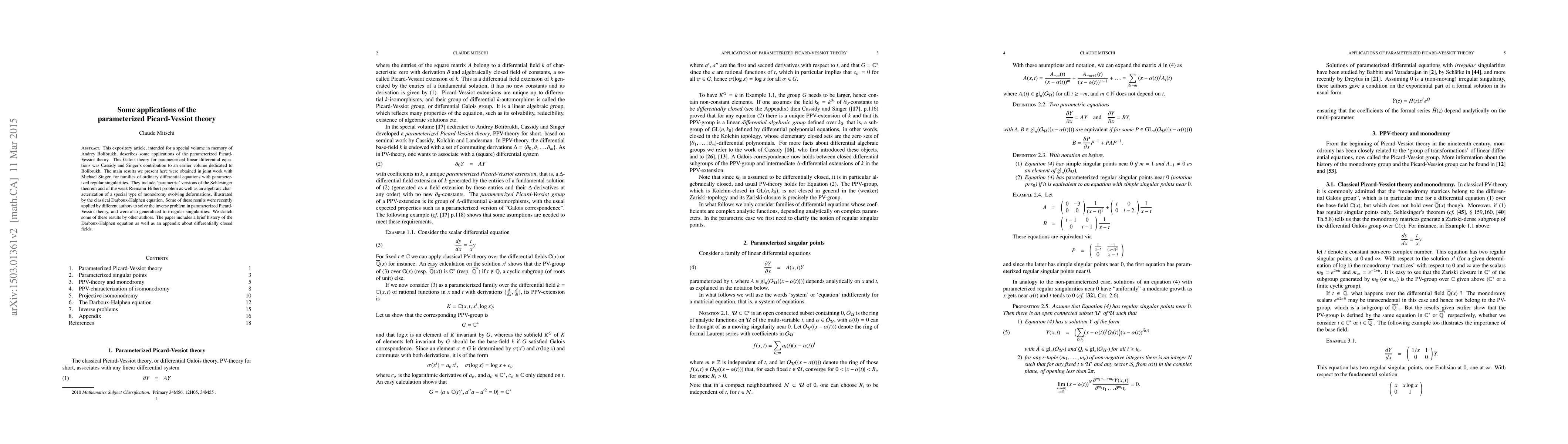 Summary: This paper explores applications of parameterized Picard-Vessiot theory in the context of ordinary differential equations, focusing on its relevance to the study of monodromy. The work highlights the theory's utility in understanding the behavior of differential equations under parameter variations.