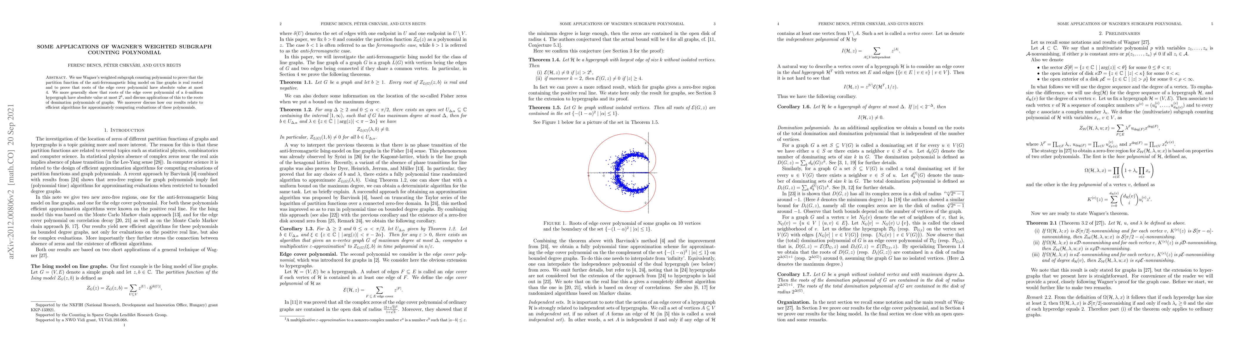 We use Wagner's weighted subgraph counting polynomial to prove that the partition function of the anti-ferromagnetic Ising model on line graphs is real rooted and to prove that roots of the edge cover polynomial have length at most $4$. We moreover discuss how our results relate to efficient algorithms for approximately computing evaluations of these polynomials.