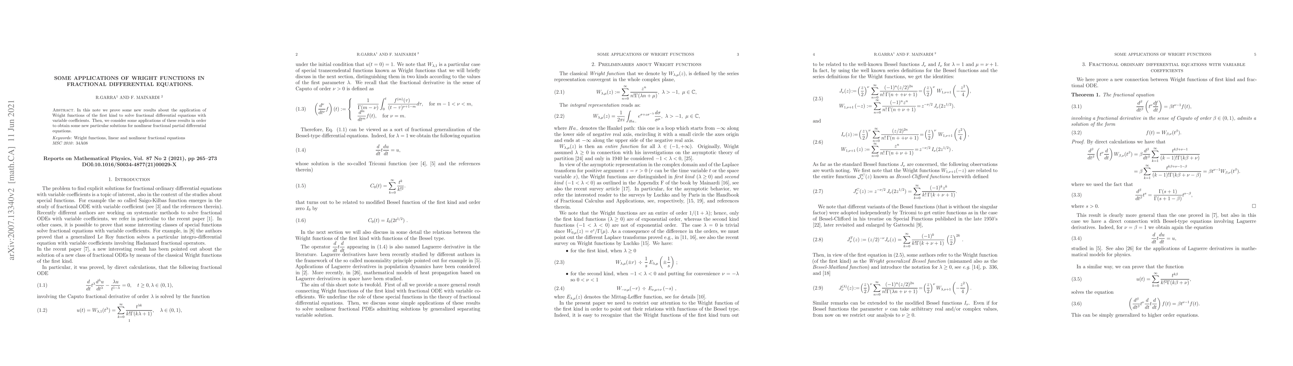 Summary: This paper explores the use of Wright functions to solve fractional differential equations with variable coefficients, deriving new results and applying them to find particular solutions for nonlinear fractional partial differential equations.