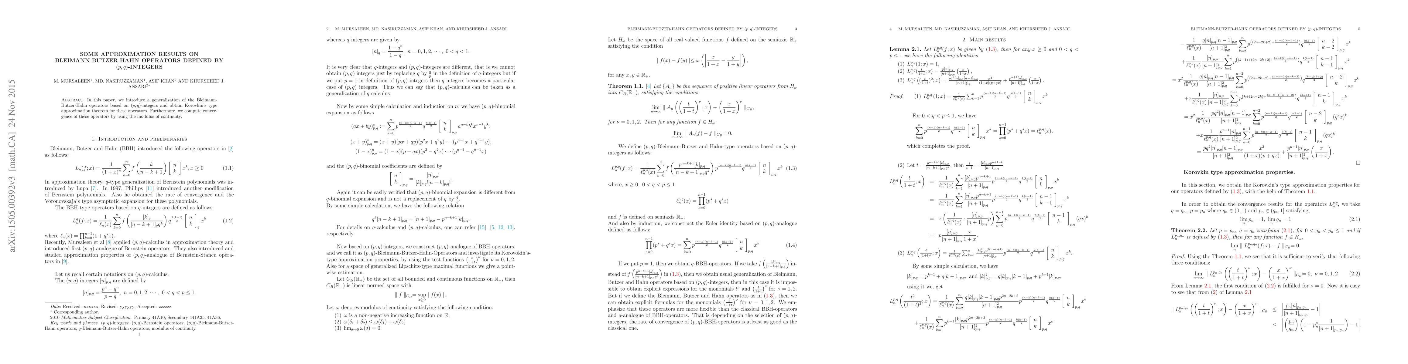 This paper introduces a generalization of Bleimann-Butzer-Hahn operators based on (p,q)-integers and proves approximation theorems using Korovkin's type approximation and modulus of continuity methods.