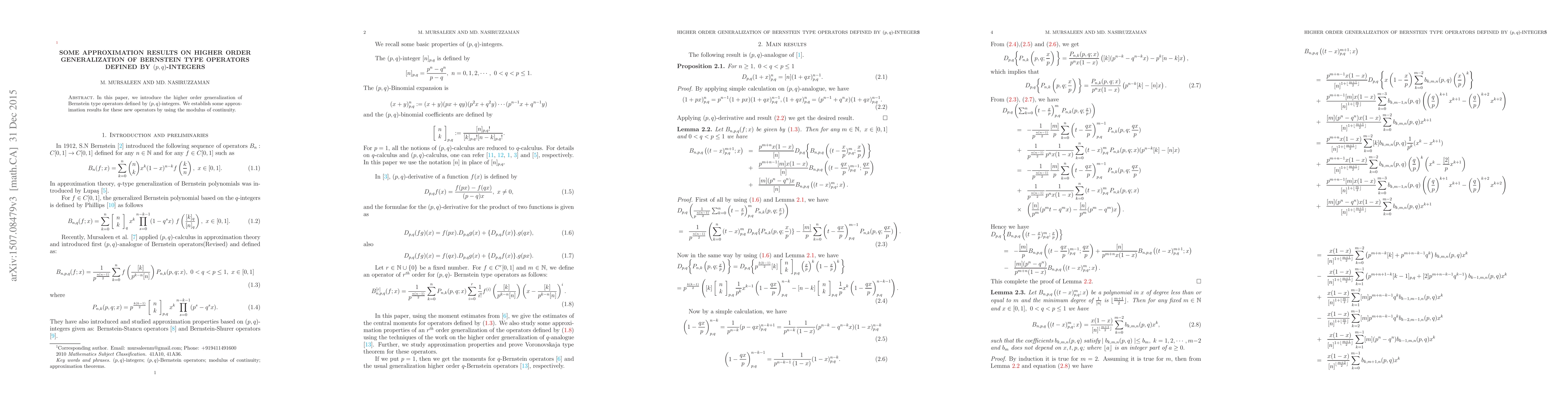 In this paper, we introduce the higher order generalization of Bernstein type operators defined by (p,q)-integers. We establish some approximation results for these new operators by using the modulus of continuity.