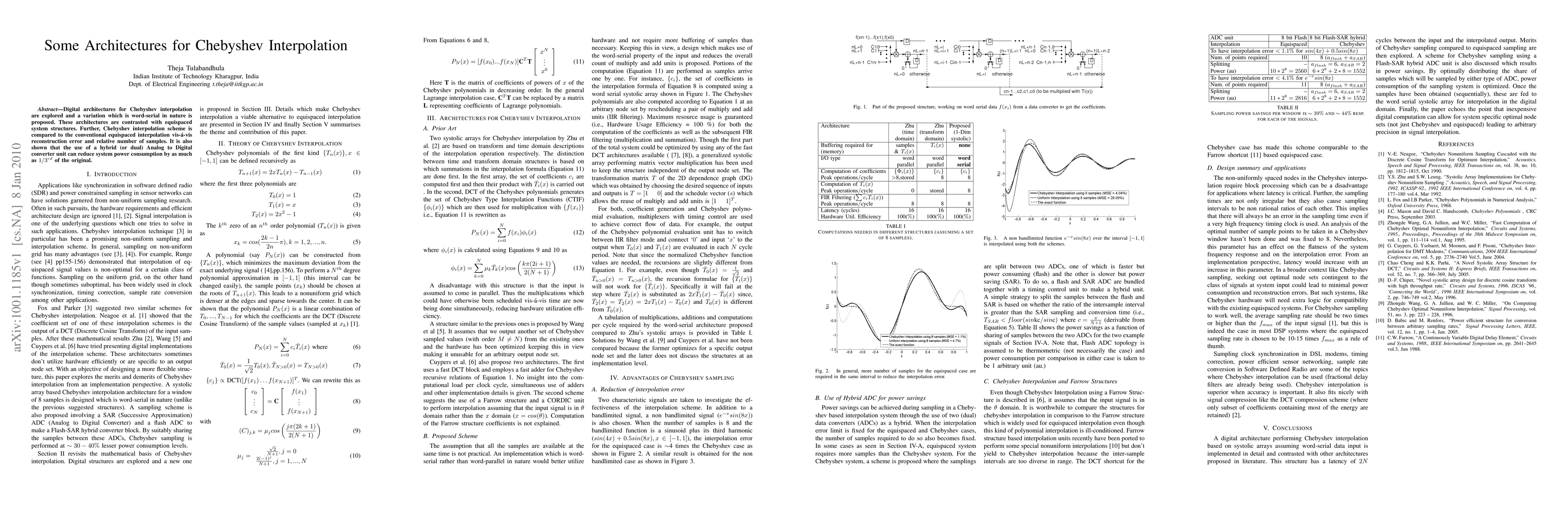 This paper explores digital architectures for Chebyshev interpolation, proposing a word-serial variation and comparing it to equispaced systems in terms of reconstruction error and sample count. It also demonstrates that a hybrid Analog to Digital converter can reduce power consumption by a third.
