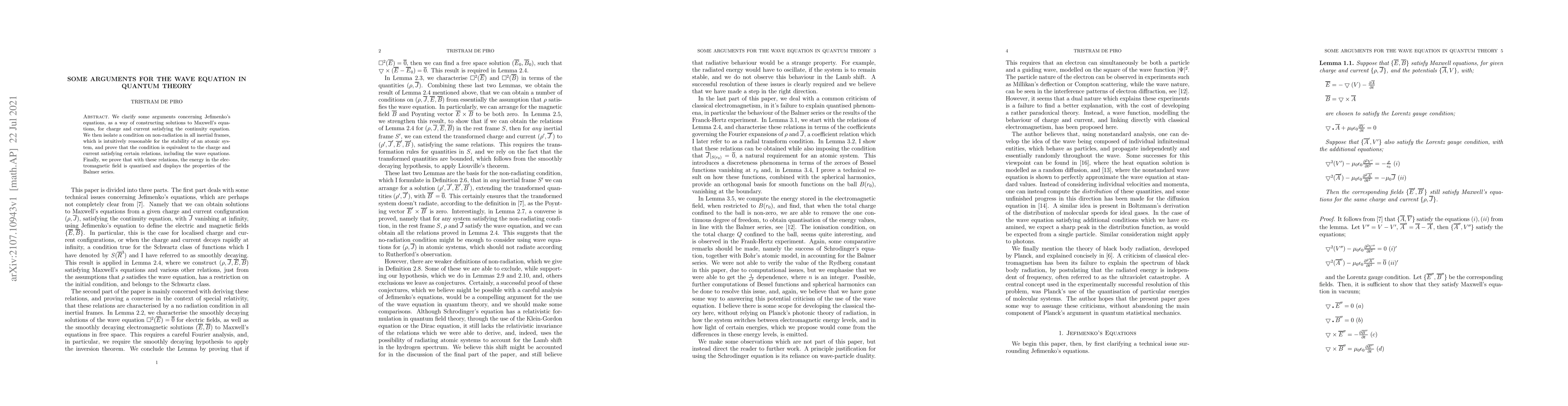 We clarify some arguments concerning Jefimenko's equations, as a way of constructing solutions to Maxwell's equations, for charge and current satisfying the continuity equation. We then isolate a condition on non-radiation in all inertial frames, which is intuitively reasonable for the stability of an atomic system, and prove that the condition is equivalent to the charge and current satisfying certain relations, including the wave equations. Finally, we prove that with these relations, the energy in the electromagnetic field is quantised and displays the properties of the Balmer series.