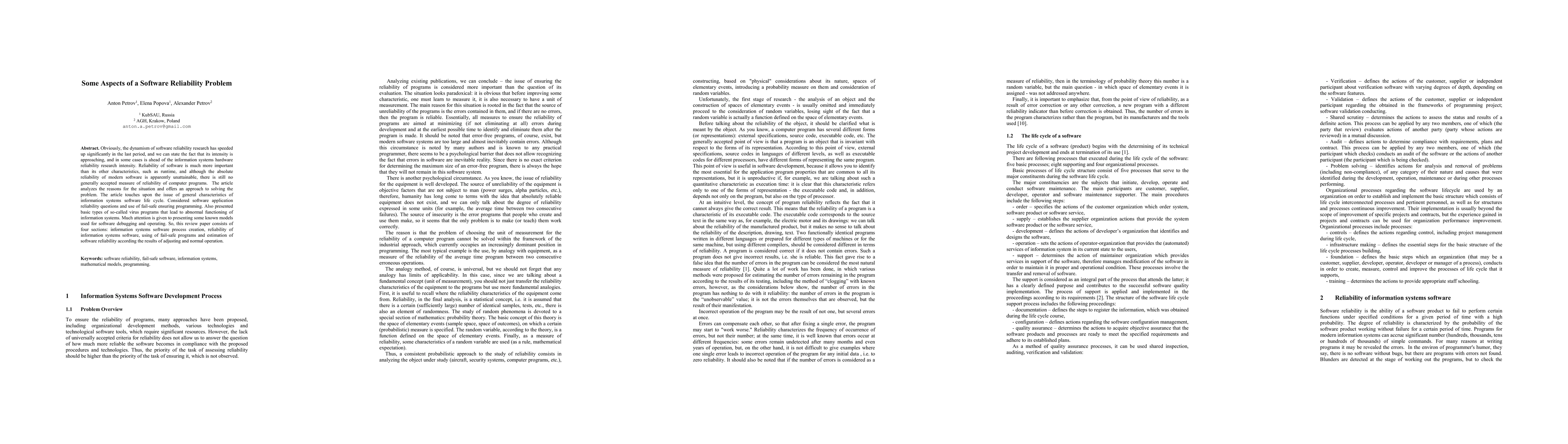 Obviously, the dynamism of software reliability research has speeded up significantly in the last period, and we can state the fact that its intensity is approaching, and in some cases is ahead of the information systems hardware reliability research intensity. Reliability of software is much more important than its other characteristics, such as runtime, and although the absolute reliability of modern software is apparently unattainable, there is still no generally accepted measure of reliability of computer programs. The article analyzes the reasons for the situation and offers an approach to solving the problem. The article touches upon the issue of general characteristics of information systems software life cycle. Considered software application reliability questions and use of fail-safe ensuring programming. Also presented basic types of so-called virus programs that lead to abnormal functioning of information systems. Much attention is given to presenting some known models used for software debugging and operating. So, this review paper consists of four sections: information systems software process creation, reliability of information systems software, using of fail-safe programs and estimation of software reliability according the results of adjusting and normal operation.