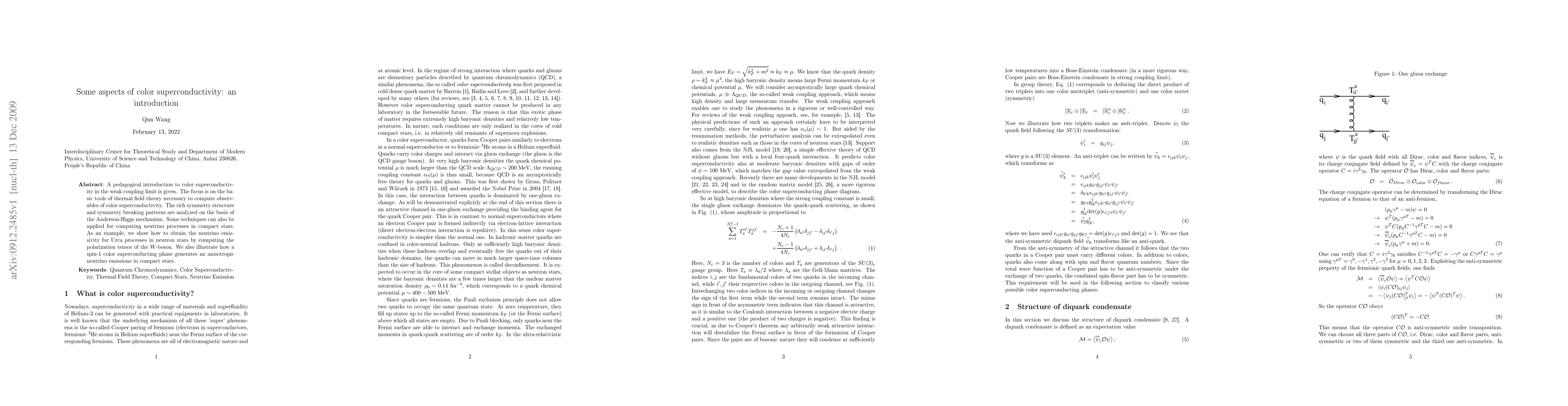 This paper provides an introductory overview of color superconductivity in the weak coupling regime, emphasizing thermal field theory tools for computations. It explores the symmetry structure and breaking patterns via the Anderson-Higgs mechanism, and demonstrates applications to neutrino processes in neutron stars, including the calculation of neutrino emissivity for Urca processes.