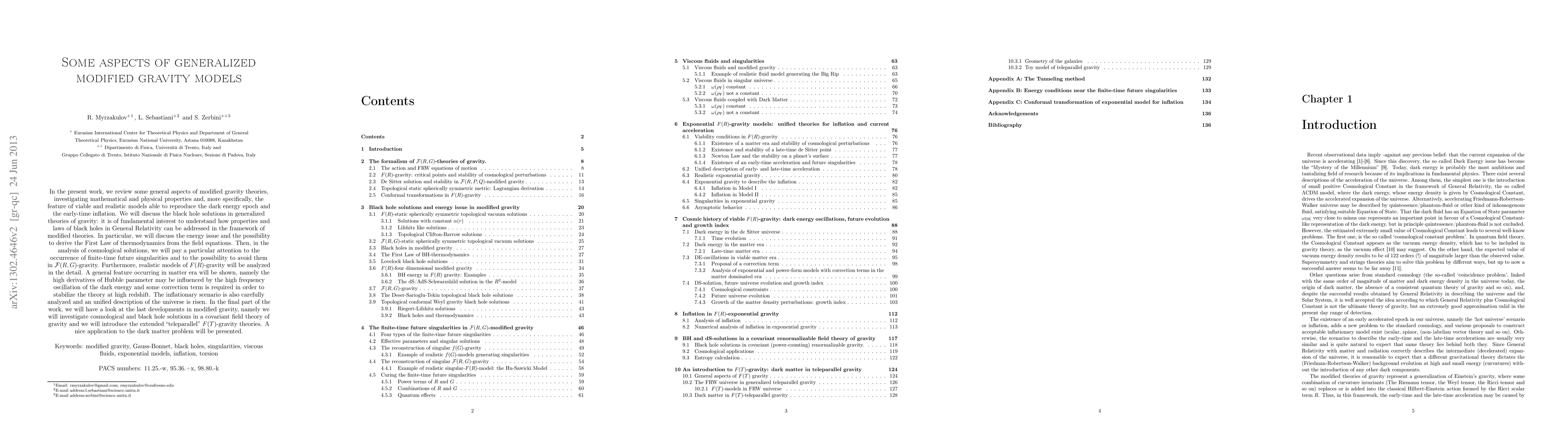 In the present work, we review some general aspects of modified gravity theories, investigating mathematical and physical properties and, more specifically, the feature of viable and realistic models able to reproduce the dark energy epoch and the early-time inflation. We will discuss the black hole solutions in generalized theories of gravity: it is of fundamental interest to understand how properties and laws of black holes in General Relativity can be addressed in the framework of modified theories. In particular, we will discuss the energy issue and the possibility to derive the First Law of thermodynamics from the field equations. Then, in the analysis of cosmological solutions, we will pay a particular attention to the occurrence of finite-time future singularities and to the possibility to avoid them in $\mathcal F(R,G)$-gravity. Furthermore, realistic models of $F(R)$-gravity will be analyzed in the detail. A general feature occurring in matter era will be shown, namely the high derivatives of Hubble parameter may be influenced by the high frequency oscillation of the dark energy and some correction term is required in order to stabilize the theory at high redshift. The inflationary scenario is also carefully analyzed and an unified description of the universe is risen. In the final part of the work, we will have a look at the last developments in modified gravity, namely we will investigate cosmological and black hole solutions in a covariant field theory of gravity and we will introduce the extended "teleparallel" $F(T)$-gravity theories. A nice application to the dark matter problem will be presented.
