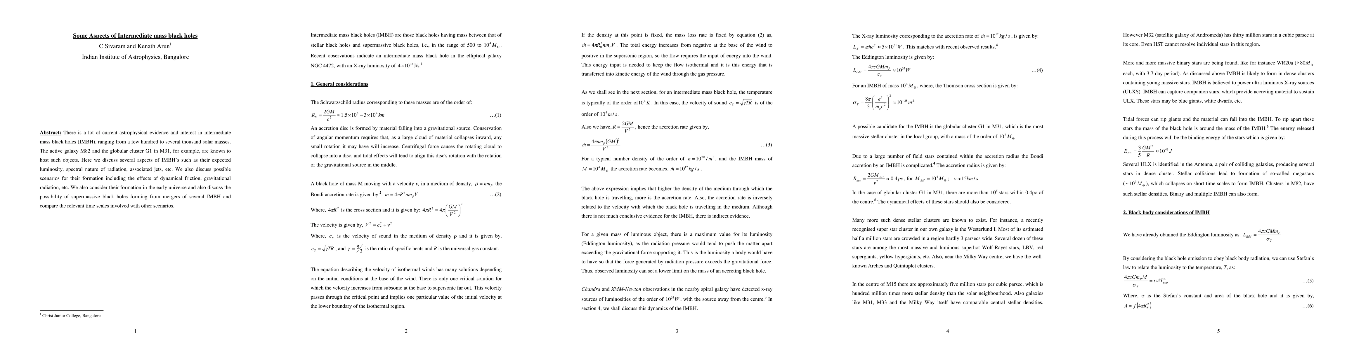 This paper explores intermediate mass black holes (IMBHs) ranging from a few hundred to several thousand solar masses, focusing on their luminosity, spectral radiation, and associated jets. It discusses formation scenarios, including dynamical friction and gravitational radiation, and considers their potential role in the formation of supermassive black holes via mergers.