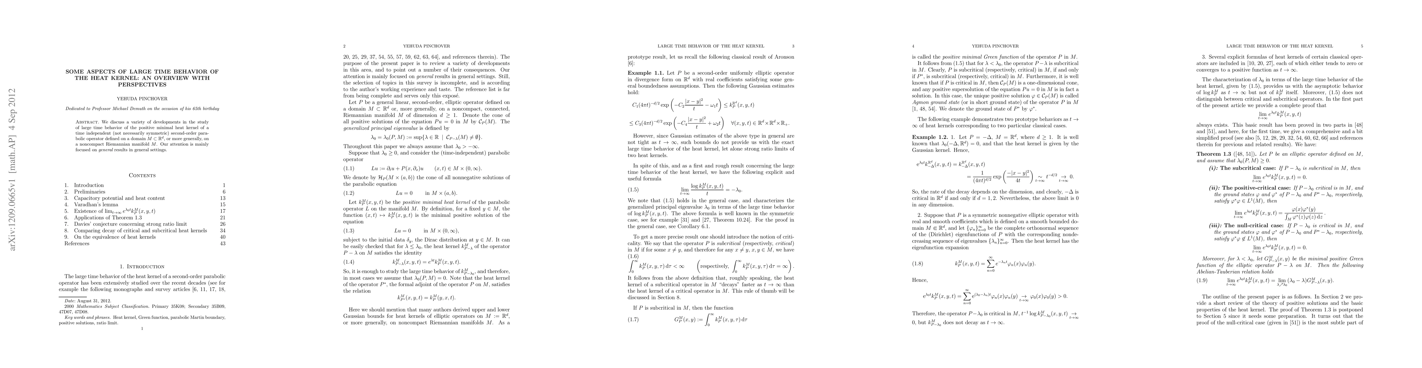 We discuss a variety of developments in the study of large time behavior of the positive minimal heat kernel of a time independent (not necessarily symmetric) second-order parabolic operator defined on a domain M in $R^d$, or more generally, on a noncompact Riemannian manifold M. Our attention is mainly focused on general results in general settings.