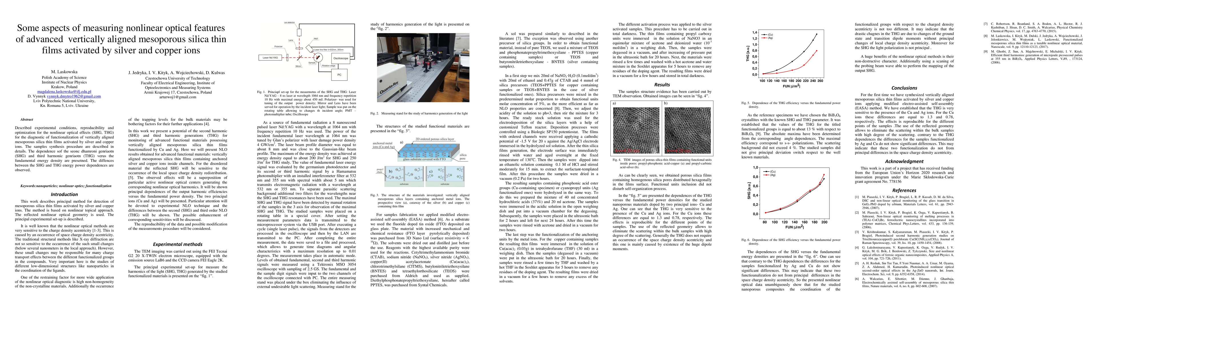 Described experimental conditions, reproducibility and optimization for the nonlinear optical effects (SHG, THG) for the diagnostic of functionalization of vertically aligned mesoporous silica thin films activated by silver and copper ions. The samples synthesis procedure are described in details. The dependence sof the seonc dhamroni genriaotn (SHG) and third harmonic genriaotn (THG) verus the fundamental energy density are presetned. The diffences between the SHG and THG energy power dependences are observed.