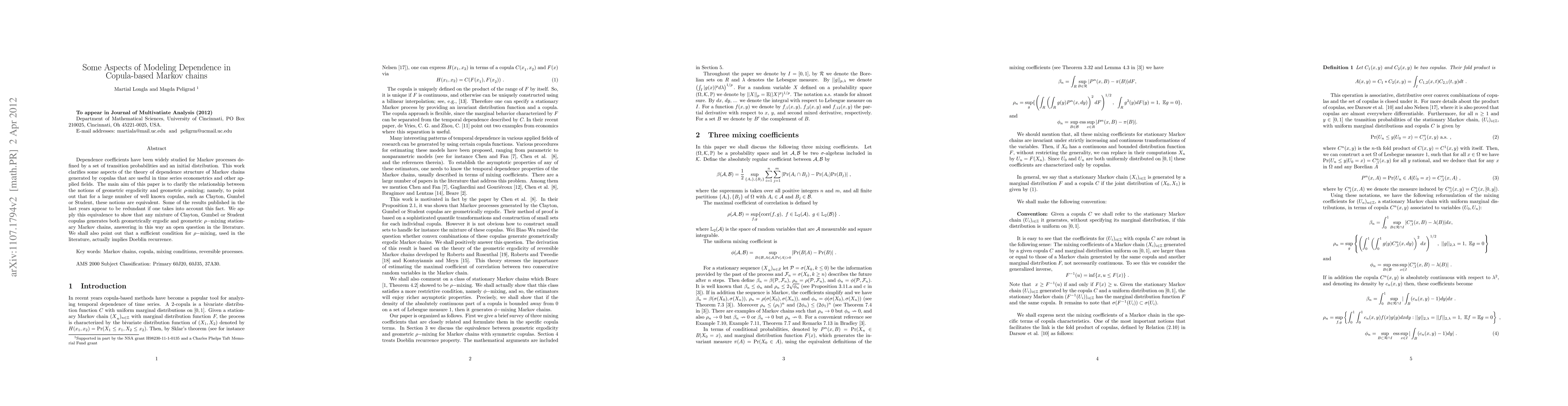 Dependence coefficients have been widely studied for Markov processes defined by a set of transition probabilities and an initial distribution. This work clarifies some aspects of the theory of dependence structure of Markov chains generated by copulas that are useful in time series econometrics and other applied fields. The main aim of this paper is to clarify the relationship between the notions of geometric ergodicity and geometric {\rho}-mixing; namely, to point out that for a large number of well known copulas, such as Clayton, Gumbel or Student, these notions are equivalent. Some of the results published in the last years appear to be redundant if one takes into account this fact. We apply this equivalence to show that any mixture of Clayton, Gumbel or Student copulas generate both geometrically ergodic and geometric {\rho}-mixing stationary Markov chains, answering in this way an open question in the literature. We shall also point out that a sufficient condition for {\rho}-mixing, used in the literature, actually implies Doeblin recurrence.