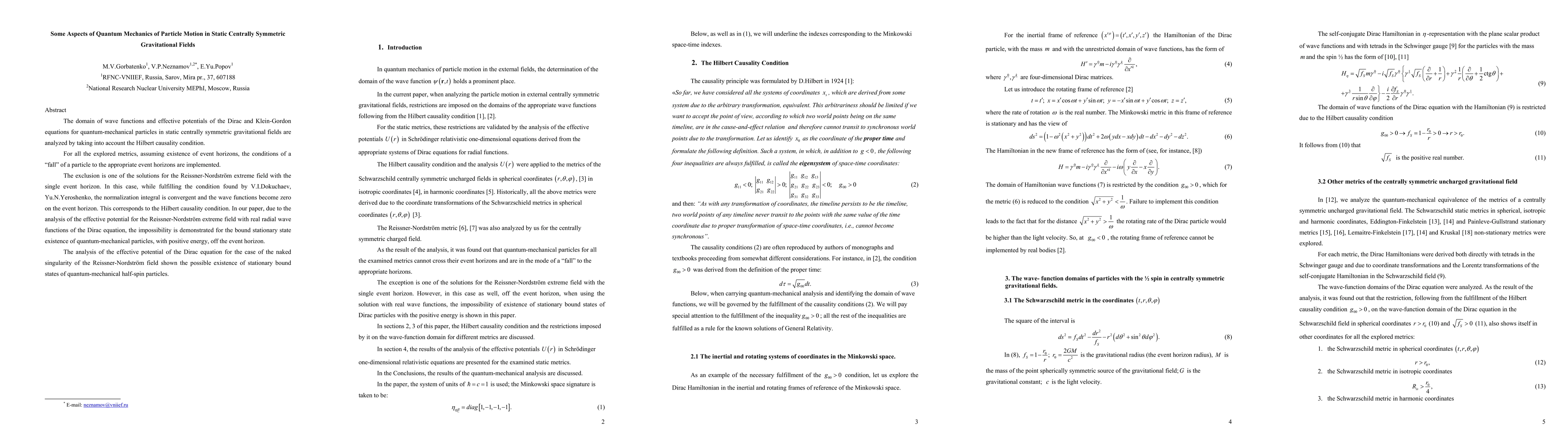 The domain of wave functions and effective potentials of the Dirac and Klein-Gordon equations for quantum-mechanical particles in static centrally symmetric gravitational fields are analyzed by taking into account the Hilbert causality condition. For all the explored metrics, assuming existence of event horizons, the conditions of a "fall" of a particle to the appropriate event horizons are implemented. The exclusion is one of the solutions for the Reissner-Nordstroem extreme field with the single event horizon. In this case, while fulfilling the condition found by V.I.Dokuchaev, Yu.N.Yeroshenko, the normalization integral is convergent and the wave functions become zero on the event horizon. This corresponds to the Hilbert causality condition. In our paper, due to the analysis of the effective potential for the Reissner-Nordstroem extreme field with real radial wave functions of the Dirac equation, the impossibility is demonstrated for the bound stationary state existence of quantum-mechanical particles, with positive energy, off the event horizon. The analysis of the effective potential of the Dirac equation for the case of the naked singularity of the Reissner-Nordstroem field shown the possible existence of stationary bound states of quantum-mechanical half-spin particles.