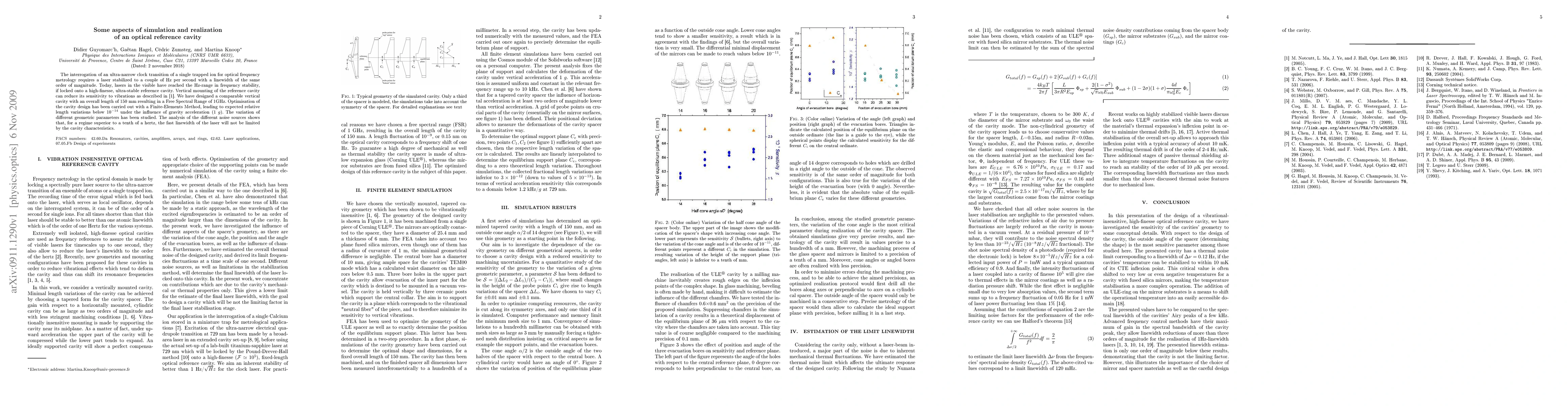 The interrogation of an ultra-narrow clock transition of a single trapped ion for optical frequency metrology requires a laser stabilized to a couple of Hz per second with a linewidth of the same order of magnitude. Today, lasers in the visible have reached the Hz-range in frequency stability, if locked onto a high-finesse, ultra-stable reference cavity. Vertical mounting of the reference cavity can reduce its sensitivity to vibrations as described in \cite{notcutt05}. We have designed a comparable vertical cavity with an overall length of 150 mm resulting in a Free Spectral Range of 1GHz. Optimisation of the cavity design has been carried out with a Finite-Elements Method, leading to expected relative length variations below 10$^{-14}$ under the influence of gravity acceleration (1 $g$). The variation of different geometric parameters has been studied. The analysis of the different noise sources shows that, for a regime superior to a tenth of a hertz, the fast linewidth of the laser will not be limited by the cavity characteristics.