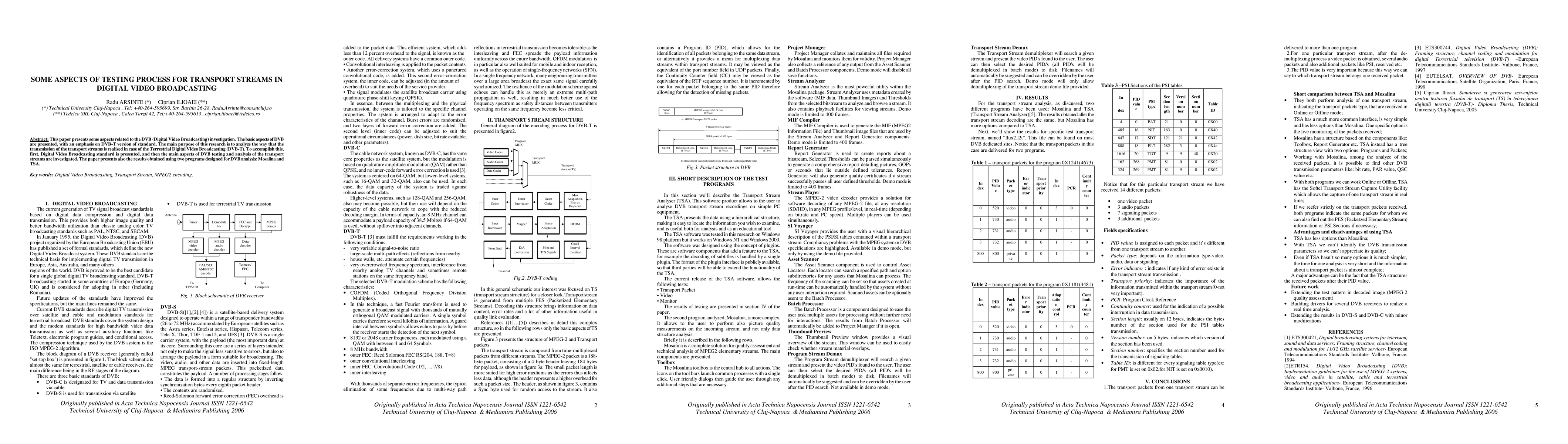 This paper investigates the DVB-T standard and the testing process for terrestrial digital video broadcasting transport streams, presenting results from two specialized analysis programs, Mosalina and TSA. The study emphasizes the mechanisms of DVB transmission and the evaluation of transport streams.