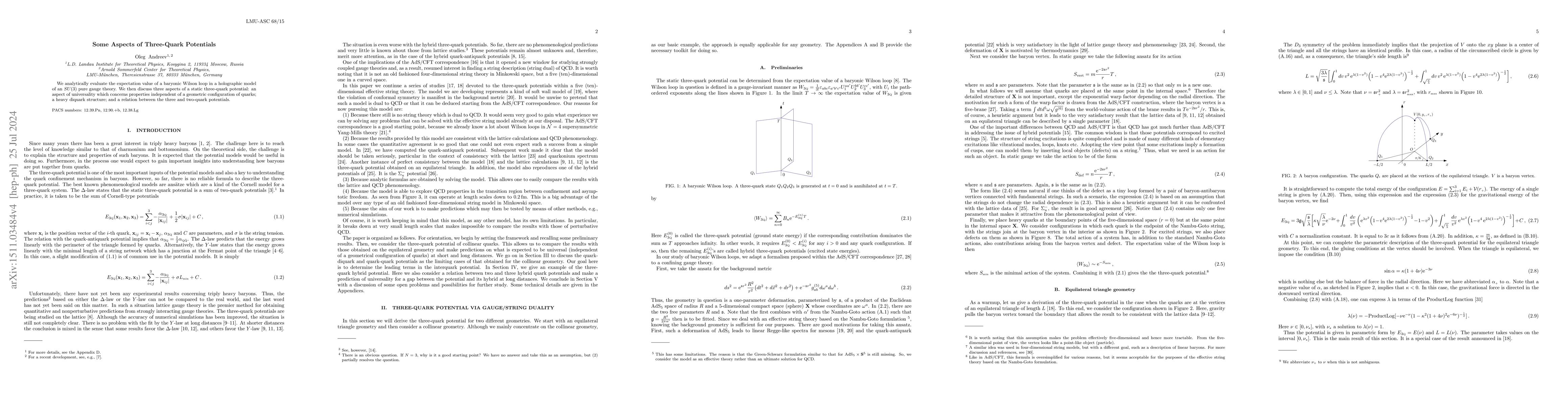 This paper evaluates the baryonic Wilson loop in an SU(3) pure gauge theory using a holographic model, and explores three-quark potentials focusing on universality, heavy diquark structures, and the relationship between three-quark and two-quark potentials.