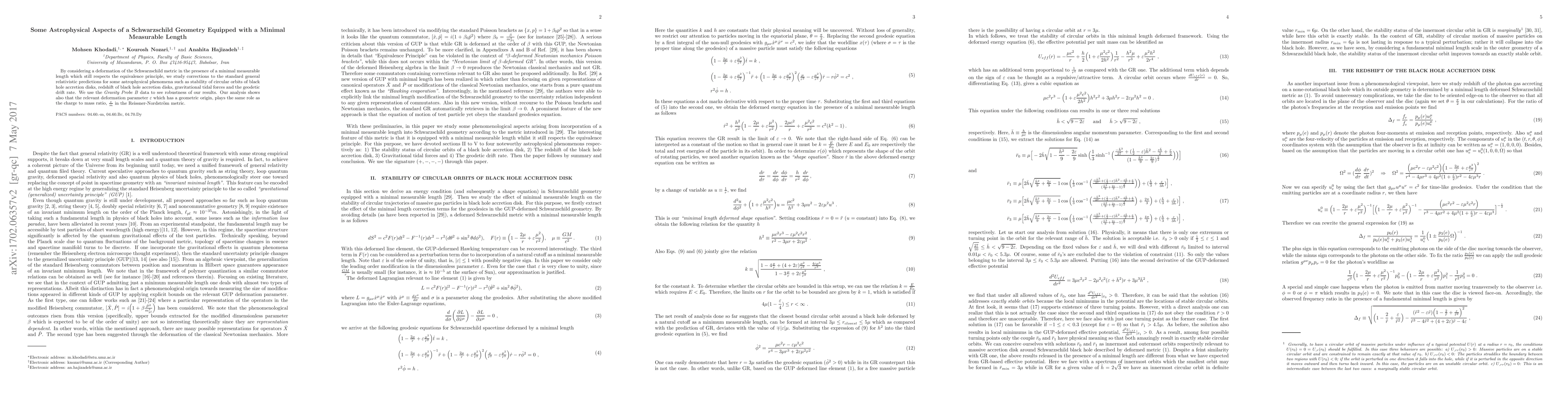 This paper examines a modified Schwarzschild geometry incorporating a minimal measurable length, analyzing its effects on astrophysical phenomena like black hole accretion disk stability and redshift. The study finds that the deformation parameter $\varepsilon$ parallels the charge to mass ratio in Reissner-Nordström metrics, and validates results using Gravity Probe B data.